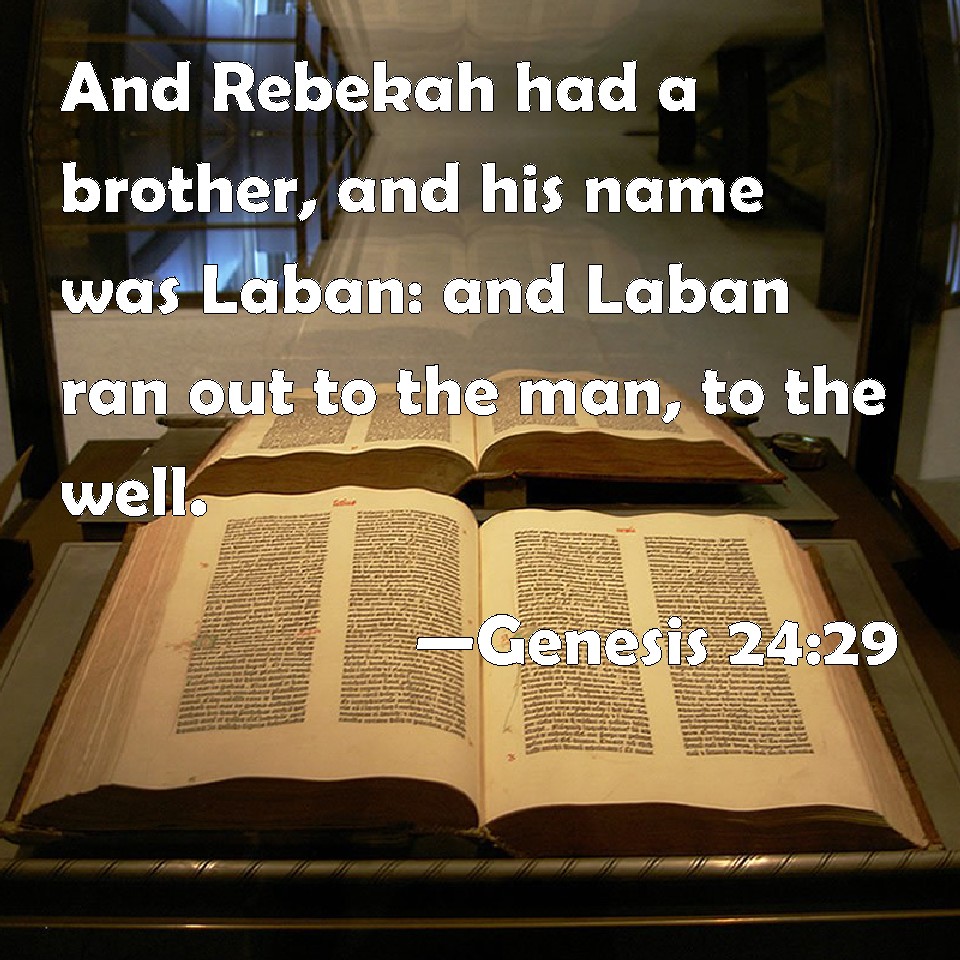 Choose a Background Genesis 24:29 And Rebekah had a brother, and his name was Laban: and Laban ran out to the man, to the well. KJV: And Rebekah had a brother, and his name was Laban: and Laban ran out unto the man, unto the well. DRB: And Rebecca had a brother named Laban, who went out in haste to the man, to the well. DBT: And Rebecca had a brother, named Laban; and Laban ran out to the man, to the well. ERV: And Rebekah had a brother, and his name was Laban: and Laban ran out unto the man, unto the fountain. WBT: And Rebekah had a brother, and his name was Laban: and Laban ran out to the man, to the well. WEB: Rebekah had a brother, and his name was Laban. Laban ran out to the man, to the spring. YLT: And Rebekah hath a brother, and his name is Laban, and Laban runneth unto the man who is without, unto the fountain;Links Genesis 24:29 NIV • Genesis 24:29 NLT • Genesis 24:29 ESV • Genesis 24:29 NASB • Genesis 24:29 KJV • Genesis 24:29 Interlinear • Genesis 24:29 Commentaries • Genesis 24:29 Parallel Texts • Genesis 24:29 Bible Apps • Genesis 24:29 Parallel • Bible Hub |