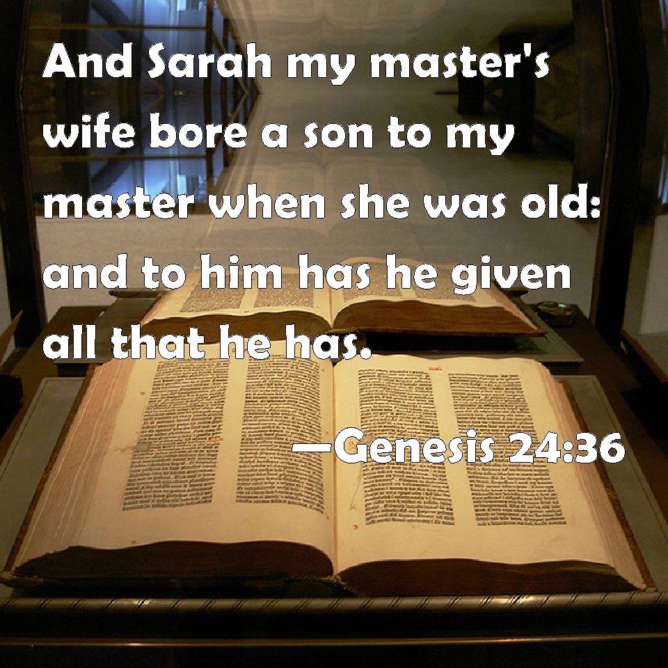 Choose a Background Genesis 24:36 And Sarah my master's wife bore a son to my master when she was old: and to him has he given all that he has. KJV: And Sarah my master's wife bare a son to my master when she was old: and unto him hath he given all that he hath. DRB: And Sara my master's wife hath borne my master a son in her old age, and he hath given him all that he had. DBT: And Sarah, my master's wife, bore a son to my master after she had grown old; and unto him has he given all that he has. ERV: And Sarah my master's wife bare a son to my master when she was old: and unto him hath he given all that he hath. WBT: And Sarah, my master's wife, bore a son to my master when she was old: and to him hath he given all that he hath. WEB: Sarah, my master's wife, bore a son to my master when she was old. He has given all that he has to him. YLT: and Sarah, my lord's wife, beareth a son to my lord, after she hath been aged, and he giveth to him all that he hath.Links Genesis 24:36 NIV • Genesis 24:36 NLT • Genesis 24:36 ESV • Genesis 24:36 NASB • Genesis 24:36 KJV • Genesis 24:36 Interlinear • Genesis 24:36 Commentaries • Genesis 24:36 Parallel Texts • Genesis 24:36 Bible Apps • Genesis 24:36 Parallel • Bible Hub |