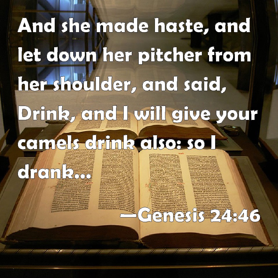 Choose a Background Genesis 24:46 And she made haste, and let down her pitcher from her shoulder, and said, Drink, and I will give your camels drink also: so I drank, and she made the camels drink also. KJV: And she made haste, and let down her pitcher from her shoulder, and said, Drink, and I will give thy camels drink also: so I drank, and she made the camels drink also. DRB: And she speedily let down the pitcher from her shoulder, and said to me: Both drink thou, and to thy camels I will give drink. I drank, and she watered the camels. DBT: And she hasted and let down her pitcher from her shoulder, and said, Drink, and I will give thy camels drink also. And I drank; and she gave the camels drink also. ERV: And she made haste, and let down her pitcher from her shoulder, and said, Drink, and I will give thy camels drink also: so I drank, and she made the camels drink also. WBT: And she made haste, and let down her pitcher from her shoulder, and said, Drink, and I will give thy camels drink also: so I drank, and she made the camels drink also. WEB: She hurried and let down her pitcher from her shoulder, and said, 'Drink, and I will also give your camels a drink.' So I drank, and she also gave the camels a drink. YLT: and she hasteth and letteth down her pitcher from off her and saith, Drink, and thy camels also I water; and I drink, and the camels also she hath watered.Links Genesis 24:46 NIV • Genesis 24:46 NLT • Genesis 24:46 ESV • Genesis 24:46 NASB • Genesis 24:46 KJV • Genesis 24:46 Interlinear • Genesis 24:46 Commentaries • Genesis 24:46 Parallel Texts • Genesis 24:46 Bible Apps • Genesis 24:46 Parallel • Bible Hub |