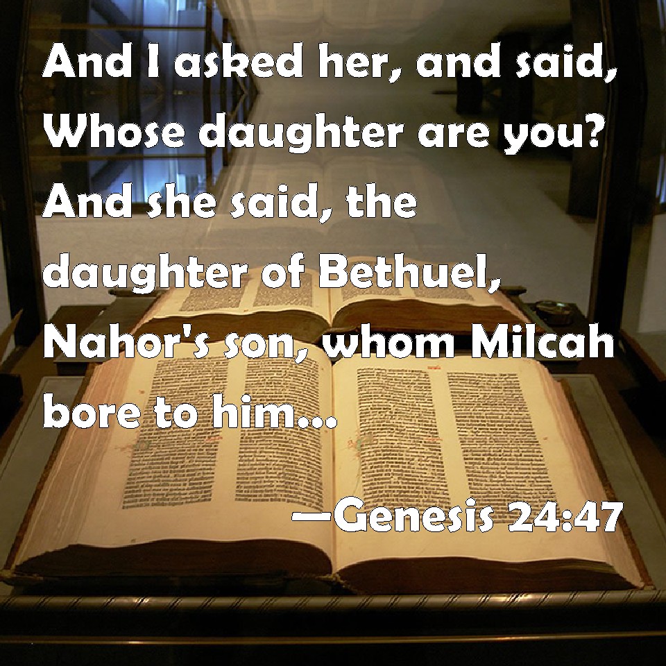Choose a Background Genesis 24:47 And I asked her, and said, Whose daughter are you? And she said, the daughter of Bethuel, Nahor's son, whom Milcah bore to him: and I put the earring on her face, and the bracelets on her hands. KJV: And I asked her, and said, Whose daughter art thou? And she said, The daughter of Bethuel, Nahor's son, whom Milcah bare unto him: and I put the earring upon her face, and the bracelets upon her hands. DRB: And I asked her, and said: Whose daughter art thou? And she answered: I am the daughter of Bathuel, the son of Nachor, whom Melcha bore to him. So I put earrings on her to adorn her face, and I put bracelets on her hands. DBT: And I asked her, and said, Whose daughter art thou? And she said, The daughter of Bethuel, Nahor's son, whom Milcah bore to him. And I put the ring on her nose, and the bracelets on her hands. ERV: And I asked her, and said, Whose daughter art thou? And she said, The daughter of Bethuel, Nahor's son, whom Milcah bare unto him: and I put the ring upon her nose, and the bracelets upon her hands. WBT: And I asked her, and said, Whose daughter art thou? And she said, The daughter of Bethuel, Nahor's son, whom Milcah bore to him: and I put the ear-ring upon her face, and the bracelets upon her hands. WEB: I asked her, and said, 'Whose daughter are you?' She said, 'The daughter of Bethuel, Nahor's son, whom Milcah bore to him.' I put the ring on her nose, and the bracelets on her hands. YLT: And I ask her, and say, Whose daughter art thou? and she saith, Daughter of Bethuel, son of Nahor, whom Milcah hath borne to him, and I put the ring on her nose, and the bracelets on her hands,Links Genesis 24:47 NIV • Genesis 24:47 NLT • Genesis 24:47 ESV • Genesis 24:47 NASB • Genesis 24:47 KJV • Genesis 24:47 Interlinear • Genesis 24:47 Commentaries • Genesis 24:47 Parallel Texts • Genesis 24:47 Bible Apps • Genesis 24:47 Parallel • Bible Hub |