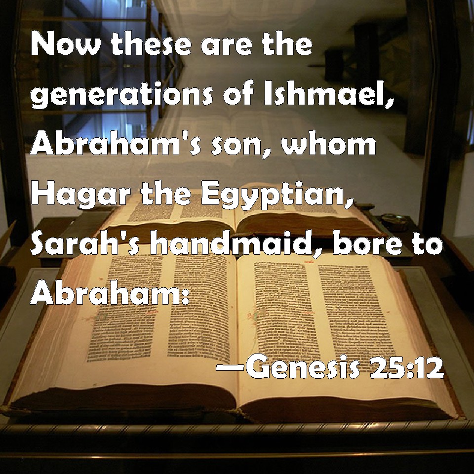 Choose a Background Genesis 25:12 Now these are the generations of Ishmael, Abraham's son, whom Hagar the Egyptian, Sarah's handmaid, bore to Abraham: KJV: Now these are the generations of Ishmael, Abraham's son, whom Hagar the Egyptian, Sarah's handmaid, bare unto Abraham: DRB: These are the generations of Ismael the son of Abraham, whom Agar the Egyptian, Sara's servant, bore unto him: DBT: And these are the generations of Ishmael, Abraham's son, whom Hagar the Egyptian, Sarah's bondwoman, bore to Abraham. ERV: Now these are the generations of Ishmael, Abraham's son, whom Hagar the Egyptian, Sarah's handmaid, bare unto Abraham: WBT: Now these are the generations of Ishmael, Abraham's son, whom Hagar the Egyptian, Sarah's handmaid, bore to Abraham. WEB: Now this is the history of the generations of Ishmael, Abraham's son, whom Hagar the Egyptian, Sarah's handmaid, bore to Abraham. YLT: And these are births of Ishmael, Abraham's son, whom Hagar the Egyptian, Sarah's handmaid, hath borne to Abraham;Links Genesis 25:12 NIV • Genesis 25:12 NLT • Genesis 25:12 ESV • Genesis 25:12 NASB • Genesis 25:12 KJV • Genesis 25:12 Interlinear • Genesis 25:12 Commentaries • Genesis 25:12 Parallel Texts • Genesis 25:12 Bible Apps • Genesis 25:12 Parallel • Bible Hub |