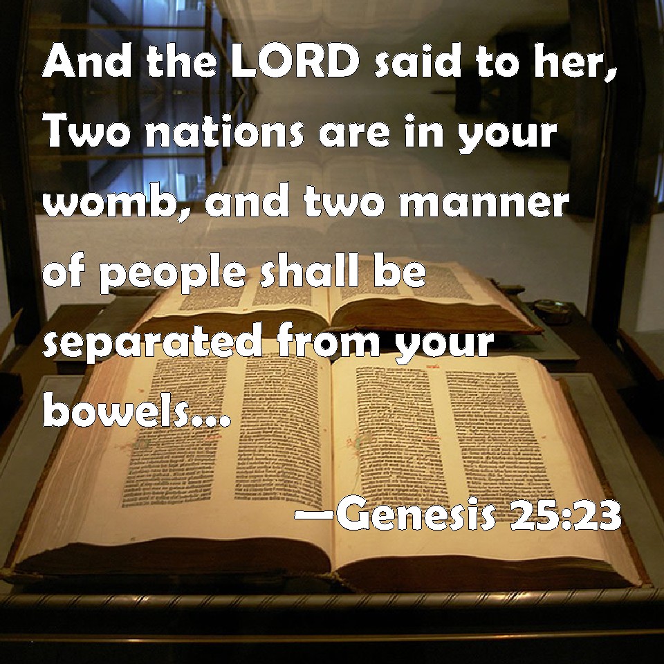 Choose a Background Genesis 25:23 And the LORD said to her, Two nations are in your womb, and two manner of people shall be separated from your bowels; and the one people shall be stronger than the other people; and the elder shall serve the younger. KJV: And the LORD said unto her, Two nations are in thy womb, and two manner of people shall be separated from thy bowels; and the one people shall be stronger than the other people; and the elder shall serve the younger. DRB: And he answering said: Two nations are in thy womb, and two peoples shall be divided out of thy womb, and one people shall overcome the other, and the elder shall serve the younger. DBT: And Jehovah said to her, Two nations are in thy womb, And two peoples shall be separated from thy bowels; And one people shall be stronger than the other people, And the elder shall serve the younger. ERV: And the LORD said unto her, Two nations are in thy womb, And two peoples shall be separated even from thy bowels: And the one people shall be stronger than the other people; And the elder shall serve the younger. WBT: And the LORD said to her, Two nations are in thy womb, and two manner of people shall be separated from thy bowels: and the one people shall be stronger than the other people; and the elder shall serve the younger. WEB: Yahweh said to her, "Two nations are in your womb. Two peoples will be separated from your body. The one people will be stronger than the other people. The elder will serve the younger." YLT: And Jehovah saith to her, 'Two nations are in thy womb, and two peoples from thy bowels are parted; and the one people than the other people is stronger; and the elder doth serve the younger.'Links Genesis 25:23 NIV • Genesis 25:23 NLT • Genesis 25:23 ESV • Genesis 25:23 NASB • Genesis 25:23 KJV • Genesis 25:23 Interlinear • Genesis 25:23 Commentaries • Genesis 25:23 Parallel Texts • Genesis 25:23 Bible Apps • Genesis 25:23 Parallel • Bible Hub |