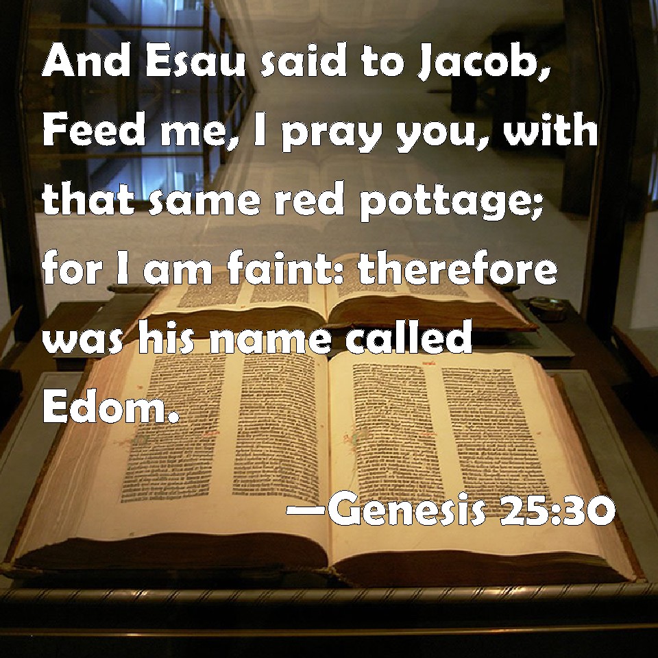 Choose a Background Genesis 25:30 And Esau said to Jacob, Feed me, I pray you, with that same red pottage; for I am faint: therefore was his name called Edom. KJV: And Esau said to Jacob, Feed me, I pray thee, with that same red pottage; for I am faint: therefore was his name called Edom. DRB: Said: Give me of this red pottage, for I am exceeding faint. For which reason his name was called Edom. DBT: And Esau said to Jacob, Feed me, I pray thee, with the red the red thing there, for I am faint. Therefore was his name called Edom. ERV: and Esau said to Jacob, Feed me, I pray thee, with that same red pottage; for I am faint: therefore was his name called Edom. WBT: And Esau said to Jacob, Feed me, I pray thee, with that same red pottage; for I am faint: therefore was his name called Edom. WEB: Esau said to Jacob, "Please feed me with that same red stew, for I am famished." Therefore his name was called Edom. YLT: and Esau saith unto Jacob, 'Let me eat, I pray thee, some of this red red thing, for I am weary;' therefore hath one called his name Edom Red;Links Genesis 25:30 NIV • Genesis 25:30 NLT • Genesis 25:30 ESV • Genesis 25:30 NASB • Genesis 25:30 KJV • Genesis 25:30 Interlinear • Genesis 25:30 Commentaries • Genesis 25:30 Parallel Texts • Genesis 25:30 Bible Apps • Genesis 25:30 Parallel • Bible Hub |