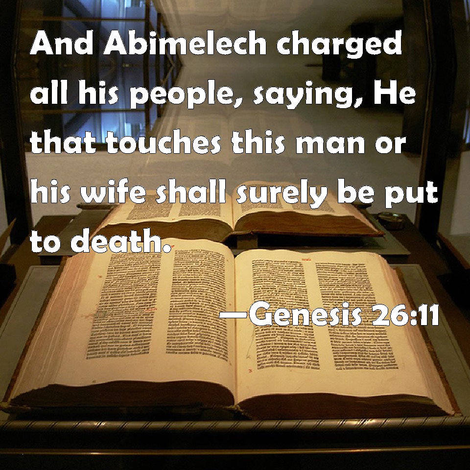Choose a Background Genesis 26:11 And Abimelech charged all his people, saying, He that touches this man or his wife shall surely be put to death. KJV: And Abimelech charged all his people, saying, He that toucheth this man or his wife shall surely be put to death. DRB: He that shall touch this man's wife, shall surely be put to death. DBT: And Abimelech charged all the people, saying, He that touches this man or his wife shall certainly be put to death. ERV: And Abimelech charged all the people, saying, He that toucheth this man or his wife shall surely be put to death. WBT: And Abimelech charged all his people, saying, He that toucheth this man or his wife shall surely be put to death. WEB: Abimelech commanded all the people, saying, "He who touches this man or his wife will surely be put to death." YLT: and Abimelech commandeth all the people, saying, 'He who cometh against this man or against his wife, dying doth die.'Links Genesis 26:11 NIV • Genesis 26:11 NLT • Genesis 26:11 ESV • Genesis 26:11 NASB • Genesis 26:11 KJV • Genesis 26:11 Interlinear • Genesis 26:11 Commentaries • Genesis 26:11 Parallel Texts • Genesis 26:11 Bible Apps • Genesis 26:11 Parallel • Bible Hub |