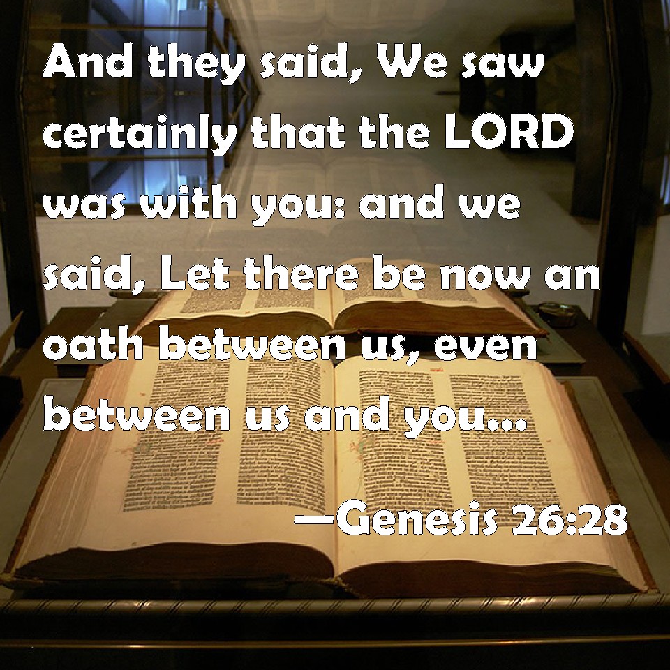 Choose a Background Genesis 26:28 And they said, We saw certainly that the LORD was with you: and we said, Let there be now an oath between us, even between us and you, and let us make a covenant with you; KJV: And they said, We saw certainly that the LORD was with thee: and we said, Let there be now an oath betwixt us, even betwixt us and thee, and let us make a covenant with thee; DRB: And they answered: We saw that the Lord is with thee, and therefore we said: Let there be an oath between us, and let us make a covenant, DBT: And they said, We saw certainly that Jehovah is with thee; and we said, Let there be then an oath between us between us and thee, and let us make a covenant with thee, ERV: And they said, We saw plainly that the LORD was with thee: and we said, Let there now be an oath betwixt us, even betwixt us and thee, and let us make a covenant with thee; WBT: And they said, We saw certainly that the LORD was with thee: and we said, Let there be now an oath betwixt us, even betwixt us and thee, and let us make a covenant with thee; WEB: They said, "We saw plainly that Yahweh was with you. We said, 'Let there now be an oath between us, even between us and you, and let us make a covenant with you, YLT: And they say, 'We have certainly seen that Jehovah hath been with thee, and we say, 'Let there be, we pray thee, an oath between us, between us and thee, and let us make a covenant with thee;Links Genesis 26:28 NIV • Genesis 26:28 NLT • Genesis 26:28 ESV • Genesis 26:28 NASB • Genesis 26:28 KJV • Genesis 26:28 Interlinear • Genesis 26:28 Commentaries • Genesis 26:28 Parallel Texts • Genesis 26:28 Bible Apps • Genesis 26:28 Parallel • Bible Hub |