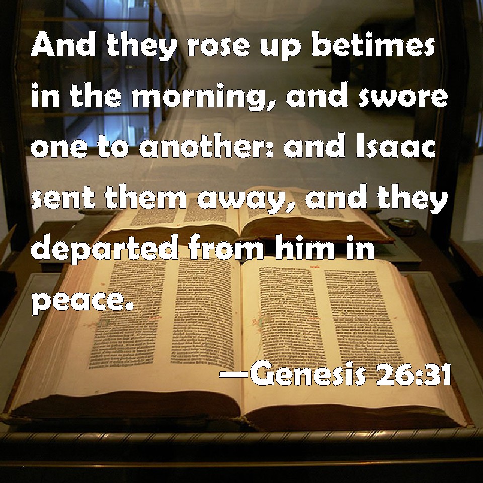 Choose a Background Genesis 26:31 And they rose up betimes in the morning, and swore one to another: and Isaac sent them away, and they departed from him in peace. KJV: And they rose up betimes in the morning, and sware one to another: and Isaac sent them away, and they departed from him in peace. DRB: Arising in the morning, they swore one to another: and Isaac sent them away peaceably to their own home. DBT: And they rose early in the morning, and swore one to another; and Isaac sent them away, and they departed from him in peace. ERV: And they rose up betimes in the morning, and sware one to another: and Isaac sent them away, and they departed from him in peace. WBT: And they rose betimes in the morning, and swore one to another: and Isaac sent them away, and they departed from him in peace. WEB: They rose up some time in the morning, and swore one to another. Isaac sent them away, and they departed from him in peace. YLT: and rise early in the morning, and swear one to another, and Isaac sendeth them away, and they go from him in peace.Links Genesis 26:31 NIV • Genesis 26:31 NLT • Genesis 26:31 ESV • Genesis 26:31 NASB • Genesis 26:31 KJV • Genesis 26:31 Interlinear • Genesis 26:31 Commentaries • Genesis 26:31 Parallel Texts • Genesis 26:31 Bible Apps • Genesis 26:31 Parallel • Bible Hub |