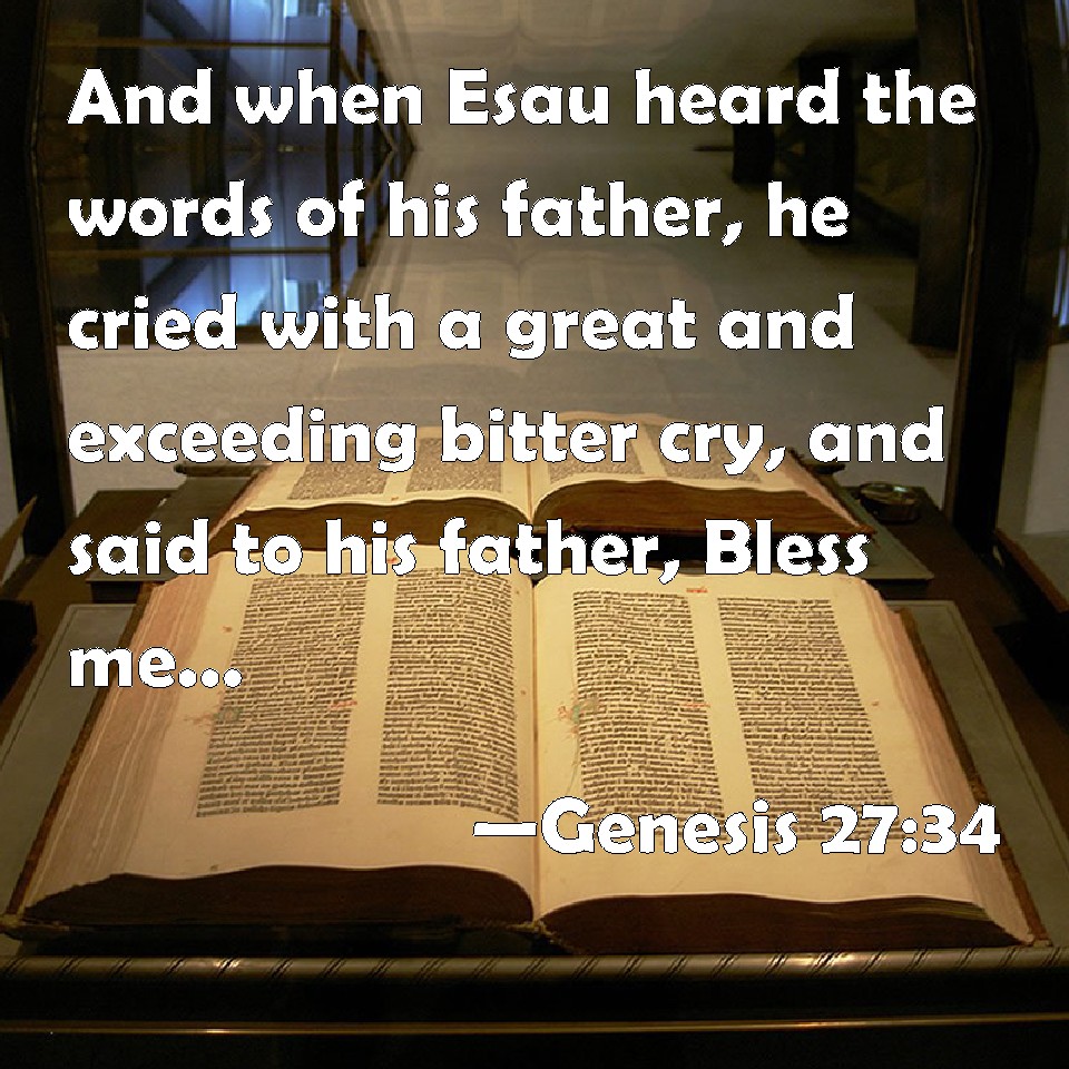 Choose a Background Genesis 27:34 And when Esau heard the words of his father, he cried with a great and exceeding bitter cry, and said to his father, Bless me, even me also, O my father. KJV: And when Esau heard the words of his father, he cried with a great and exceeding bitter cry, and said unto his father, Bless me, even me also, O my father. DRB: Esau having heard his father's words, roared out with a great cry: and being in a great consternation, said: Bless me also, my father. DBT: When Esau heard the words of his father, he cried with a great and exceeding bitter cry, and said to his father, Bless me me also, my father! ERV: When Esau heard the words of his father, he cried with an exceeding great and bitter cry, and said unto his father, Bless me, even me also, O my father. WBT: And when Esau heard the words of his father, he cried with a great and exceedingly bitter cry, and said to his father, Bless me, even me also, O my father. WEB: When Esau heard the words of his father, he cried with an exceeding great and bitter cry, and said to his father, "Bless me, even me also, my father." YLT: When Esau heareth the words of his father, then he crieth a very great and bitter cry, and saith to his father, 'Bless me, me also, O my father;'Links Genesis 27:34 NIV • Genesis 27:34 NLT • Genesis 27:34 ESV • Genesis 27:34 NASB • Genesis 27:34 KJV • Genesis 27:34 Interlinear • Genesis 27:34 Commentaries • Genesis 27:34 Parallel Texts • Genesis 27:34 Bible Apps • Genesis 27:34 Parallel • Bible Hub |