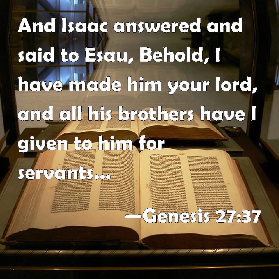 Choose a Background Genesis 27:37 And Isaac answered and said to Esau, Behold, I have made him your lord, and all his brothers have I given to him for servants; and with corn and wine have I sustained him: and what shall I do now to you, my son? KJV: And Isaac answered and said unto Esau, Behold, I have made him thy lord, and all his brethren have I given to him for servants; and with corn and wine have I sustained him: and what shall I do now unto thee, my son? DRB: Isaac answered: I have appointed him thy lord, and have made all his brethren his servants: I have established him with corn and wine, and after this, what shall I do more for thee, my son? DBT: And Isaac answered and said to Esau, Behold, I have made him lord over thee, and all his brethren have I given to him for servants, and with corn and new wine have I supplied him and what can I do now for thee, my son? ERV: And Isaac answered and said unto Esau, Behold, I have made him thy lord, and all his brethren have I given to him for servants; and with corn and wine have I sustained him: and what then shall I do for thee, my son? WBT: And Isaac answered and said to Esau, Behold, I have made him thy lord, and all his brethren have I given to him for servants; and with corn and wine have I sustained him: and what shall I do now to thee, my son? WEB: Isaac answered Esau, "Behold, I have made him your lord, and all his brothers have I given to him for servants. With grain and new wine have I sustained him. What then will I do for you, my son?" YLT: And Isaac answereth and saith to Esau, 'Lo, a mighty one have I set him over thee, and all his brethren have I given to him for servants, and with corn and wine have I sustained him; and for thee now, what shall I do, my son?'Links Genesis 27:37 NIV • Genesis 27:37 NLT • Genesis 27:37 ESV • Genesis 27:37 NASB • Genesis 27:37 KJV • Genesis 27:37 Interlinear • Genesis 27:37 Commentaries • Genesis 27:37 Parallel Texts • Genesis 27:37 Bible Apps • Genesis 27:37 Parallel • Bible Hub |