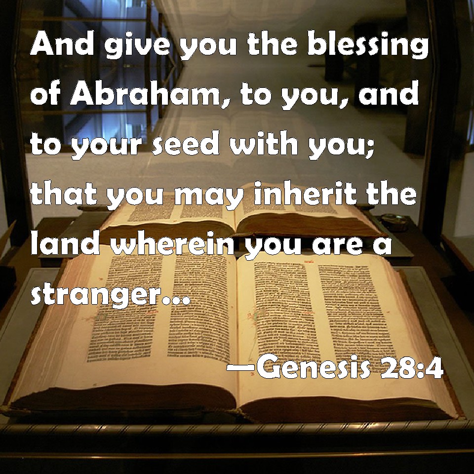 Choose a Background Genesis 28:4 And give you the blessing of Abraham, to you, and to your seed with you; that you may inherit the land wherein you are a stranger, which God gave to Abraham. KJV: And give thee the blessing of Abraham, to thee, and to thy seed with thee; that thou mayest inherit the land wherein thou art a stranger, which God gave unto Abraham. DRB: And give the blessings of Abrabam to thee, and to thy seed after thee: that thou mayst possess the land of thy sojournment, which he promised to thy grandfather. DBT: And may he give thee the blessing of Abraham, to thee and to thy seed with thee, in order that thou mayest possess the land of thy sojourning, which God gave to Abraham! ERV: and give thee the blessing of Abraham, to thee, and to thy seed with thee; that thou mayest inherit the land of thy sojournings, which God gave unto Abraham. WBT: And give thee the blessing of Abraham, to thee, and to thy seed with thee; that thou mayest inherit the land in which thou art a stranger, which God gave to Abraham. WEB: and give you the blessing of Abraham, to you, and to your seed with you, that you may inherit the land where you travel, which God gave to Abraham." YLT: and He doth give to thee the blessing of Abraham, to thee and to thy seed with thee, to cause thee to possess the land of thy sojournings, which God gave to Abraham.'Links Genesis 28:4 NIV • Genesis 28:4 NLT • Genesis 28:4 ESV • Genesis 28:4 NASB • Genesis 28:4 KJV • Genesis 28:4 Interlinear • Genesis 28:4 Commentaries • Genesis 28:4 Parallel Texts • Genesis 28:4 Bible Apps • Genesis 28:4 Parallel • Bible Hub |