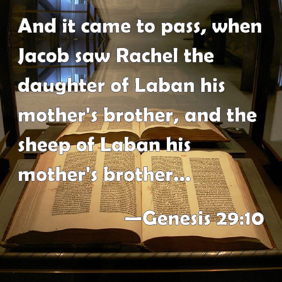 Choose a Background Genesis 29:10 And it came to pass, when Jacob saw Rachel the daughter of Laban his mother's brother, and the sheep of Laban his mother's brother, that Jacob went near, and rolled the stone from the well's mouth, and watered the flock of Laban his mother's brother. KJV: And it came to pass, when Jacob saw Rachel the daughter of Laban his mother's brother, and the sheep of Laban his mother's brother, that Jacob went near, and rolled the stone from the well's mouth, and watered the flock of Laban his mother's brother. DRB: And when Jacob saw her, and knew her to be his cousin-german, and that they were the sheep of Laban, his uncle: he removed the stone wherewith the well was closed. DBT: And it came to pass when Jacob saw Rachel the daughter of Laban his mother's brother, and the sheep of Laban his mother's brother, that Jacob went near, and rolled the stone from the mouth of the well, and watered the sheep of Laban his mother's brother. ERV: And it came to pass, when Jacob saw Rachel the daughter of Laban his mother's brother, and the sheep of Laban his mother's brother, that Jacob went near, and rolled the stone from the well's mouth, and watered the flock of Laban his mother's brother. WBT: And it came to pass, when Jacob saw Rachel, the daughter of Laban his mother's brother, and the sheep of Laban his mother's brother; that Jacob went near, and rolled the stone from the well's mouth, and watered the flock of Laban his mother's brother. WEB: It happened, when Jacob saw Rachel the daughter of Laban, his mother's brother, and the sheep of Laban, his mother's brother, that Jacob went near, and rolled the stone from the well's mouth, and watered the flock of Laban his mother's brother. YLT: and it cometh to pass when Jacob hath seen Rachel, daughter of Laban his mother's brother, and the flock of Laban his mother's brother, that Jacob cometh nigh and rolleth the stone from off the mouth of the well, and watereth the flock of Laban his mother's brother.Links Genesis 29:10 NIV • Genesis 29:10 NLT • Genesis 29:10 ESV • Genesis 29:10 NASB • Genesis 29:10 KJV • Genesis 29:10 Interlinear • Genesis 29:10 Commentaries • Genesis 29:10 Parallel Texts • Genesis 29:10 Bible Apps • Genesis 29:10 Parallel • Bible Hub |