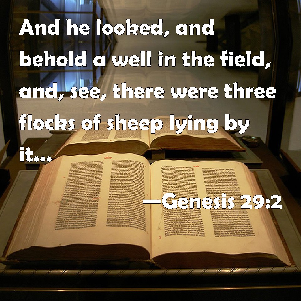 Choose a Background Genesis 29:2 And he looked, and behold a well in the field, and, see, there were three flocks of sheep lying by it; for out of that well they watered the flocks: and a great stone was on the well's mouth. KJV: And he looked, and behold a well in the field, and, lo, there were three flocks of sheep lying by it; for out of that well they watered the flocks: and a great stone was upon the well's mouth. DRB: And he saw a well in the field, and three flocks of sheep lying by it: for the beasts were watered out of it, and the mouth thereof was closed with a great stone. DBT: And he looked, and behold, there was a well in the fields, and behold there, three flocks of sheep were lying by it; for out of that well they watered the flocks, and a great stone was at the mouth of the well. ERV: And he looked, and behold a well in the field, and, lo, three flocks of sheep lying there by it; for out of that well they watered the flocks: and the stone upon the well's mouth was great. WBT: And he looked, and behold, a well in the field, and lo, there were three flocks of sheep lying by it; for out of that well they watered the flocks: and a great stone was upon the well's mouth. WEB: He looked, and behold, a well in the field, and, behold, three flocks of sheep lying there by it. For out of that well they watered the flocks. The stone on the well's mouth was large. YLT: and he looketh, and lo, a well in the field, and lo, there three droves of a flock crouching by it, for from that well they water the droves, and the great stone is on the mouth of the well.Links Genesis 29:2 NIV • Genesis 29:2 NLT • Genesis 29:2 ESV • Genesis 29:2 NASB • Genesis 29:2 KJV • Genesis 29:2 Interlinear • Genesis 29:2 Commentaries • Genesis 29:2 Parallel Texts • Genesis 29:2 Bible Apps • Genesis 29:2 Parallel • Bible Hub |