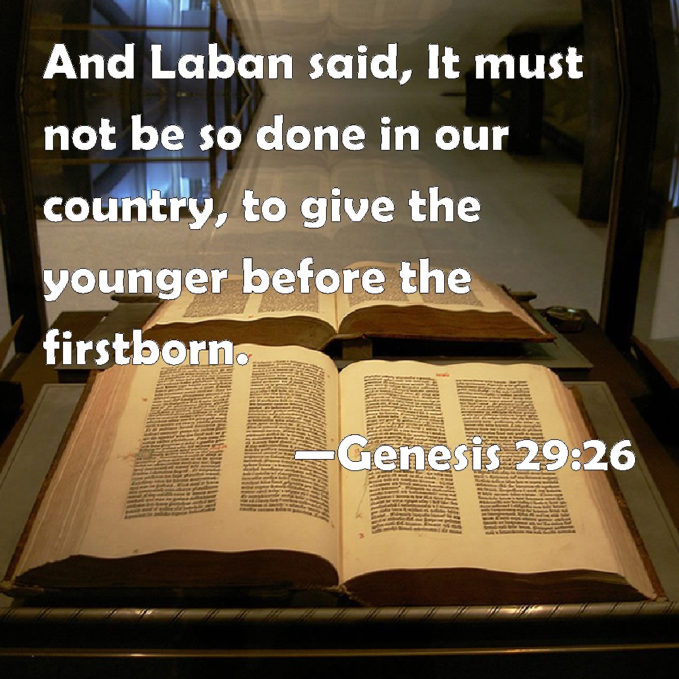 Choose a Background Genesis 29:26 And Laban said, It must not be so done in our country, to give the younger before the firstborn. KJV: And Laban said, It must not be so done in our country, to give the younger before the firstborn. DRB: Laban answered: It is not the custom in this place, to give the younger in marriage first. DBT: And Laban said, It is not so done in our place, to give the younger before the firstborn. ERV: And Laban said, It is not so done in our place, to give the younger before the firstborn. WBT: And Laban said, it must not be so done in our country, to give the younger before the first-born. WEB: Laban said, "It is not done so in our place, to give the younger before the firstborn. YLT: And Laban saith, 'It is not done so in our place, to give the younger before the first-born;Links Genesis 29:26 NIV • Genesis 29:26 NLT • Genesis 29:26 ESV • Genesis 29:26 NASB • Genesis 29:26 KJV • Genesis 29:26 Interlinear • Genesis 29:26 Commentaries • Genesis 29:26 Parallel Texts • Genesis 29:26 Bible Apps • Genesis 29:26 Parallel • Bible Hub |
