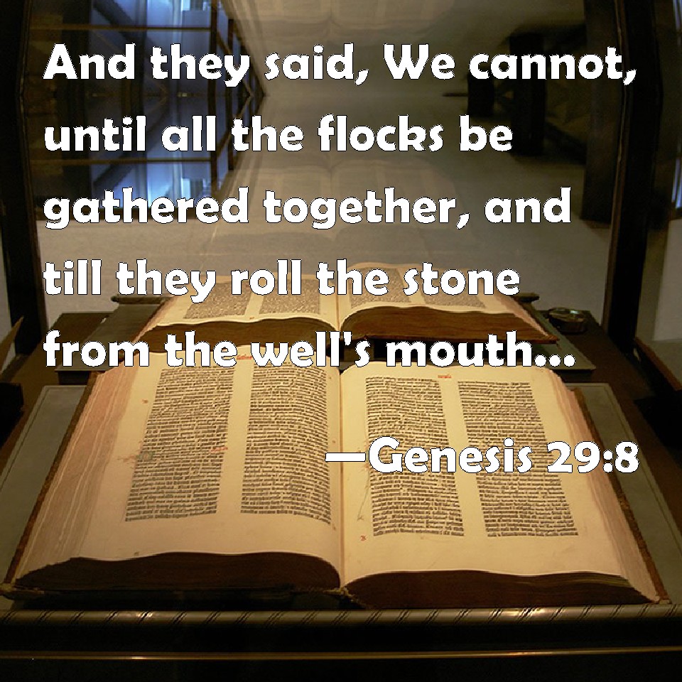 Choose a Background Genesis 29:8 And they said, We cannot, until all the flocks be gathered together, and till they roll the stone from the well's mouth; then we water the sheep. KJV: And they said, We cannot, until all the flocks be gathered together, and till they roll the stone from the well's mouth; then we water the sheep. DRB: They answered: We cannot, till all the cattle be gathered together, and we remove the stone from the well's mouth, that we may water the flocks. DBT: And they said, We cannot until all the flocks are gathered together, and they roll the stone from the mouth of the well, and we water the sheep. ERV: And they said, We cannot, until all the flocks be gathered together, and they roll the stone from the well's mouth; then we water the sheep. WBT: And they said, We cannot, until all the flocks are collected, and till they roll the stone from the well's mouth; then we water the sheep. WEB: They said, "We can't, until all the flocks are gathered together, and they roll the stone from the well's mouth. Then we water the sheep." YLT: And they say, 'We are not able, till that all the droves be gathered together, and they have rolled away the stone from the mouth of the well, and we have watered the flock.'Links Genesis 29:8 NIV • Genesis 29:8 NLT • Genesis 29:8 ESV • Genesis 29:8 NASB • Genesis 29:8 KJV • Genesis 29:8 Interlinear • Genesis 29:8 Commentaries • Genesis 29:8 Parallel Texts • Genesis 29:8 Bible Apps • Genesis 29:8 Parallel • Bible Hub |