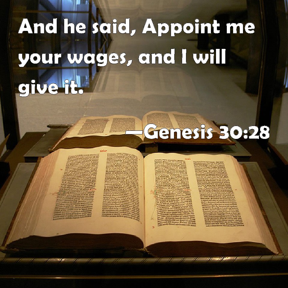 Choose a Background Genesis 30:28 And he said, Appoint me your wages, and I will give it. KJV: And he said, Appoint me thy wages, and I will give it. DRB: Appoint thy wages which I shall give thee. DBT: And he said, Appoint to me thy wages, and I will give it. ERV: And he said, Appoint me thy wages, and I will give it. WBT: And he said, Appoint me thy wages, and I will give it. WEB: He said, "Appoint me your wages, and I will give it." YLT: He saith also, 'Define thy hire to me, and I give.'Links Genesis 30:28 NIV • Genesis 30:28 NLT • Genesis 30:28 ESV • Genesis 30:28 NASB • Genesis 30:28 KJV • Genesis 30:28 Interlinear • Genesis 30:28 Commentaries • Genesis 30:28 Parallel Texts • Genesis 30:28 Bible Apps • Genesis 30:28 Parallel • Bible Hub |