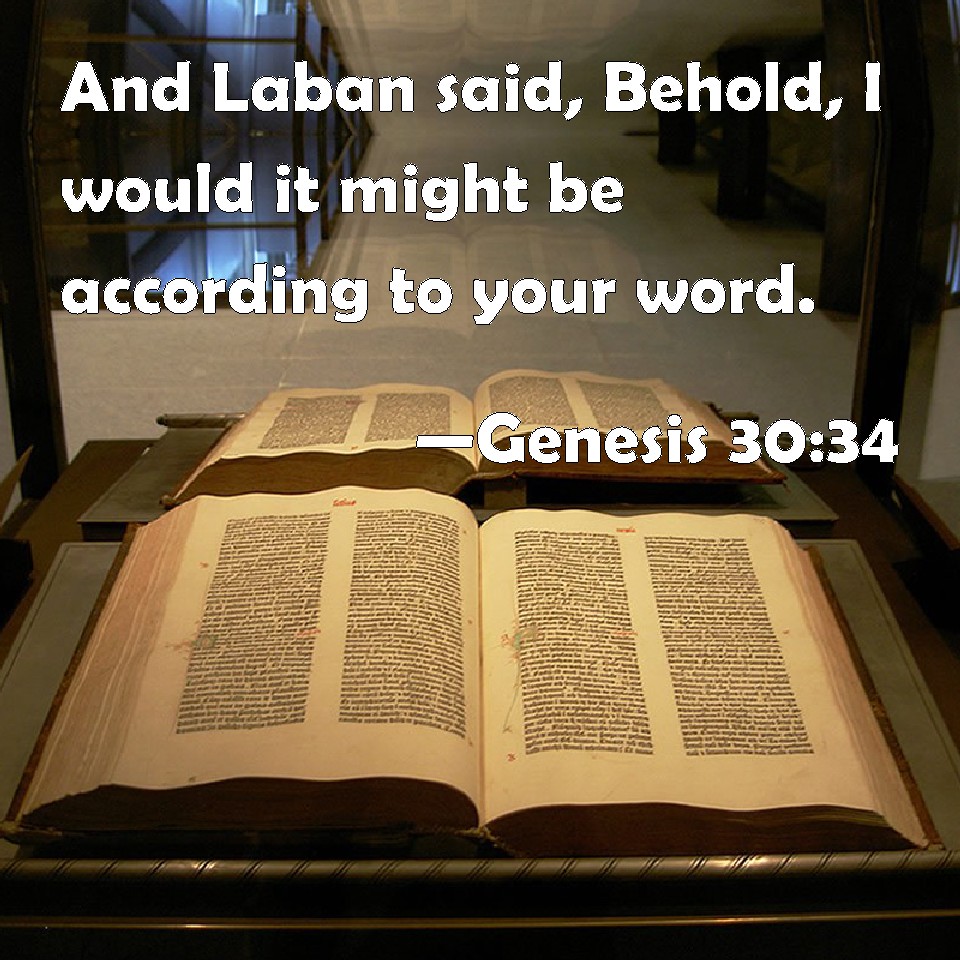 Choose a Background Genesis 30:34 And Laban said, Behold, I would it might be according to your word. KJV: And Laban said, Behold, I would it might be according to thy word. DRB: And Laban said: I like well what thou demandest. DBT: And Laban said, Well, let it be according to thy word. ERV: And Laban said, Behold, I would it might be according to thy word. WBT: And Laban said, Behold, I would it might be according to thy word. WEB: Laban said, "Behold, let it be according to your word." YLT: And Laban saith, 'Lo, O that it were according to thy word;'Links Genesis 30:34 NIV • Genesis 30:34 NLT • Genesis 30:34 ESV • Genesis 30:34 NASB • Genesis 30:34 KJV • Genesis 30:34 Interlinear • Genesis 30:34 Commentaries • Genesis 30:34 Parallel Texts • Genesis 30:34 Bible Apps • Genesis 30:34 Parallel • Bible Hub |