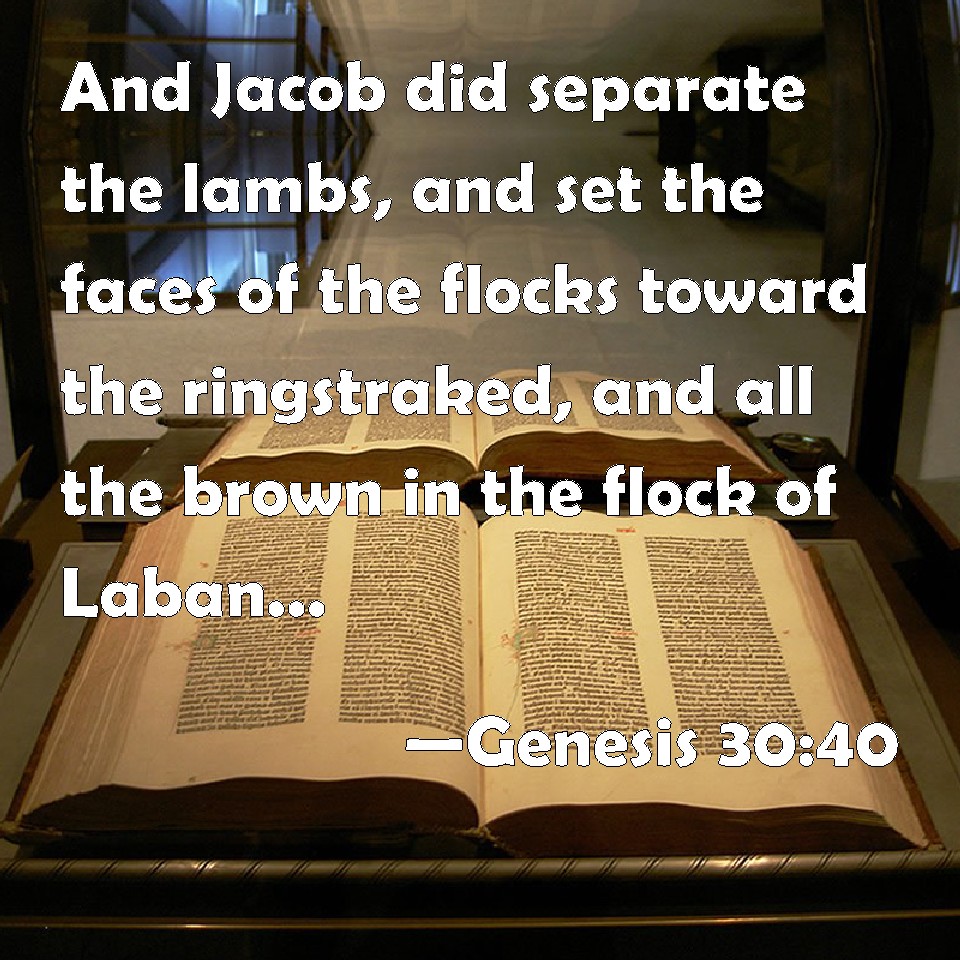 Choose a Background Genesis 30:40 And Jacob did separate the lambs, and set the faces of the flocks toward the ringstraked, and all the brown in the flock of Laban; and he put his own flocks by themselves, and put them not to Laban's cattle. KJV: And Jacob did separate the lambs, and set the faces of the flocks toward the ringstraked, and all the brown in the flock of Laban; and he put his own flocks by themselves, and put them not unto Laban's cattle. DRB: And Jacob separated the flock, and put the rods in the troughs before the eyes of the rams: and all the white and the black were Laban's: and the rest were Jacob's, when the flocks were separated one from the other. DBT: And Jacob separated the lambs, and set the faces of the flock toward the ringstraked, and all the brown in the flock of Laban; and he made himself separate flocks, and did not put them with Laban's flock. ERV: And Jacob separated the lambs, and set the faces of the flocks toward the ringstraked and all the black in the flock of Laban; and he put his own droves apart, and put them not unto Laban's flock. WBT: And Jacob separated the lambs, and set the faces of the flocks towards the ring-streaked, and all the brown in the flock of Laban: and he put his own flocks by themselves, and put them not with Laban's cattle. WEB: Jacob separated the lambs, and set the faces of the flocks toward the streaked and all the black in the flock of Laban: and he put his own droves apart, and didn't put them into Laban's flock. YLT: And the lambs hath Jacob parted, and he putteth the face of the flock towards the ring-streaked, also all the brown in the flock of Laban, and he setteth his own droves by themselves, and hath not set them near Laban's flock.Links Genesis 30:40 NIV • Genesis 30:40 NLT • Genesis 30:40 ESV • Genesis 30:40 NASB • Genesis 30:40 KJV • Genesis 30:40 Interlinear • Genesis 30:40 Commentaries • Genesis 30:40 Parallel Texts • Genesis 30:40 Bible Apps • Genesis 30:40 Parallel • Bible Hub |
