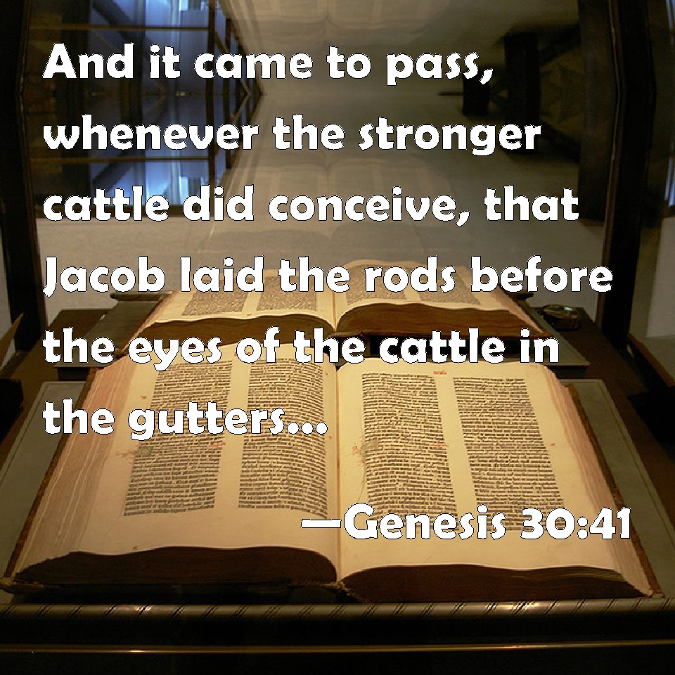 Choose a Background Genesis 30:41 And it came to pass, whenever the stronger cattle did conceive, that Jacob laid the rods before the eyes of the cattle in the gutters, that they might conceive among the rods. KJV: And it came to pass, whensoever the stronger cattle did conceive, that Jacob laid the rods before the eyes of the cattle in the gutters, that they might conceive among the rods. DRB: So when the ewes went first to ram, Jacob put the rods in the roughs of water before the eyes of the rams, and of the ewes, that they might conceive while they were looking upon them: DBT: And it came to pass whensoever the strong cattle were ardent, that Jacob laid the rods before the eyes of the flock in the gutters, that they might become ardent among the rods; ERV: And it came to pass, whensoever the stronger of the flock did conceive, that Jacob laid the rods before the eyes of the flock in the gutters, that they might conceive among the rods; WBT: And it came to pass, whenever the stronger cattle conceived, that Jacob laid the rods before the eyes of the cattle in the gutters, that they might conceive among the rods. WEB: It happened, whenever the stronger of the flock conceived, that Jacob laid the rods before the eyes of the flock in the gutters, that they might conceive among the rods; YLT: And it hath come to pass whenever the strong ones of the flock conceive, that Jacob set the rods before the eyes of the flock in the gutters, to cause them to conceive by the rods,Links Genesis 30:41 NIV • Genesis 30:41 NLT • Genesis 30:41 ESV • Genesis 30:41 NASB • Genesis 30:41 KJV • Genesis 30:41 Interlinear • Genesis 30:41 Commentaries • Genesis 30:41 Parallel Texts • Genesis 30:41 Bible Apps • Genesis 30:41 Parallel • Bible Hub |