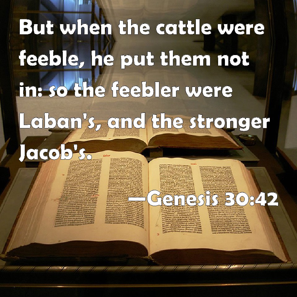 Choose a Background Genesis 30:42 But when the cattle were feeble, he put them not in: so the feebler were Laban's, and the stronger Jacob's. KJV: But when the cattle were feeble, he put them not in: so the feebler were Laban's, and the stronger Jacob's. DRB: But when the latter coming was, and the last conceiving, he did not put them. And those that were late ward, become Laban's: and they of the first time, Jacob's. DBT: but when the sheep were feeble, he put them not in; so the feeble were Laban's, and the strong Jacob's. ERV: but when the flock were feeble, he put them not in: so the feebler were Laban's, and the stronger Jacob's. WBT: But when the cattle were feeble, he put them not in: so the feebler were Laban's, and the stronger Jacob's. WEB: but when the flock were feeble, he didn't put them in. So the feebler were Laban's, and the stronger Jacob's. YLT: and when the flock is feeble, he doth not set them; and the feeble ones have been Laban's, and the strong ones Jacob's.Links Genesis 30:42 NIV • Genesis 30:42 NLT • Genesis 30:42 ESV • Genesis 30:42 NASB • Genesis 30:42 KJV • Genesis 30:42 Interlinear • Genesis 30:42 Commentaries • Genesis 30:42 Parallel Texts • Genesis 30:42 Bible Apps • Genesis 30:42 Parallel • Bible Hub |