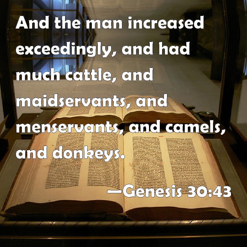 Choose a Background Genesis 30:43 And the man increased exceedingly, and had much cattle, and maidservants, and menservants, and camels, and asses. KJV: And the man increased exceedingly, and had much cattle, and maidservants, and menservants, and camels, and asses. DRB: And the man was enriched exceedingly, and he had many flocks, maid servants and men servants, camels and asses. DBT: And the man increased very, very much, and had much cattle, and bondwomen, and bondmen, and camels, and asses. ERV: And the man increased exceedingly, and had large flocks, and maidservants and menservants, and camels and asses. WBT: And the man increased exceedingly, and had many cattle, and maid-servants, and men-servants, and camels, and asses. WEB: The man increased exceedingly, and had large flocks, female servants and male servants, and camels and donkeys. YLT: And the man increaseth very exceedingly, and hath many flocks, and maid-servants, and men-servants, and camels, and asses.Links Genesis 30:43 NIV • Genesis 30:43 NLT • Genesis 30:43 ESV • Genesis 30:43 NASB • Genesis 30:43 KJV • Genesis 30:43 Interlinear • Genesis 30:43 Commentaries • Genesis 30:43 Parallel Texts • Genesis 30:43 Bible Apps • Genesis 30:43 Parallel • Bible Hub |