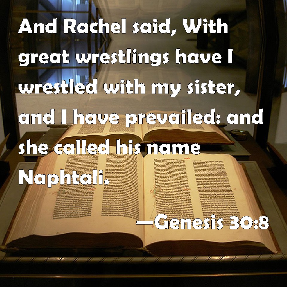 Choose a Background Genesis 30:8 And Rachel said, With great wrestlings have I wrestled with my sister, and I have prevailed: and she called his name Naphtali. KJV: And Rachel said, With great wrestlings have I wrestled with my sister, and I have prevailed: and she called his name Naphtali. DRB: For whom Rachel said: God hath compared me with my sister, and I have prevailed: and she called him Nephtali. DBT: And Rachel said, Wrestlings of God have I wrestled with my sister, and have prevailed; and she called his name Naphtali. ERV: And Rachel said, With mighty wrestlings have I wrestled with my sister, and have prevailed: and she called his name Naphtali. WBT: And Rachel said, With great wrestlings have I wrestled with my sister, and I have prevailed: and she called his name Naphtali. WEB: Rachel said, "With mighty wrestlings have I wrestled with my sister, and have prevailed." She named him Naphtali. YLT: and Rachel saith, 'With wrestlings of God I have wrestled with my sister, yea, I have prevailed;' and she calleth his name Napthali.Links Genesis 30:8 NIV • Genesis 30:8 NLT • Genesis 30:8 ESV • Genesis 30:8 NASB • Genesis 30:8 KJV • Genesis 30:8 Interlinear • Genesis 30:8 Commentaries • Genesis 30:8 Parallel Texts • Genesis 30:8 Bible Apps • Genesis 30:8 Parallel • Bible Hub |