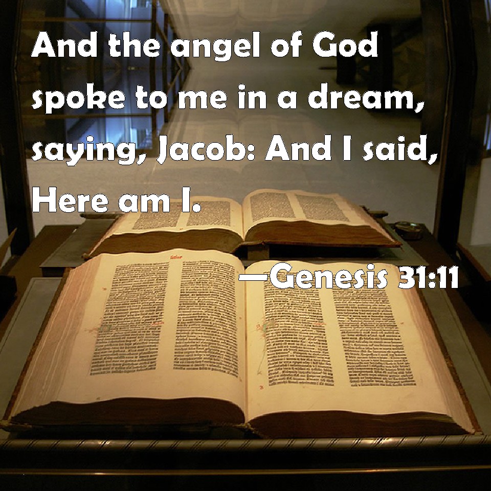 Choose a Background Genesis 31:11 And the angel of God spoke to me in a dream, saying, Jacob: And I said, Here am I. KJV: And the angel of God spake unto me in a dream, saying, Jacob: And I said, Here am I. DRB: And the angel of God said to me in my sleep: Jacob? And I answered: Here I am. DBT: And the Angel of God said to me in a dream, Jacob! And I said, Here am I. ERV: And the angel of God said unto me in the dream, Jacob: and I said, Here am I. WBT: And the angel of God spoke to me in a dream, saying, Jacob: And I said, Here am I. WEB: The angel of God said to me in the dream, 'Jacob,' and I said, 'Here I am.' YLT: and the messenger of God saith unto me in the dream, Jacob, and I say, Here am I.Links Genesis 31:11 NIV • Genesis 31:11 NLT • Genesis 31:11 ESV • Genesis 31:11 NASB • Genesis 31:11 KJV • Genesis 31:11 Interlinear • Genesis 31:11 Commentaries • Genesis 31:11 Parallel Texts • Genesis 31:11 Bible Apps • Genesis 31:11 Parallel • Bible Hub |