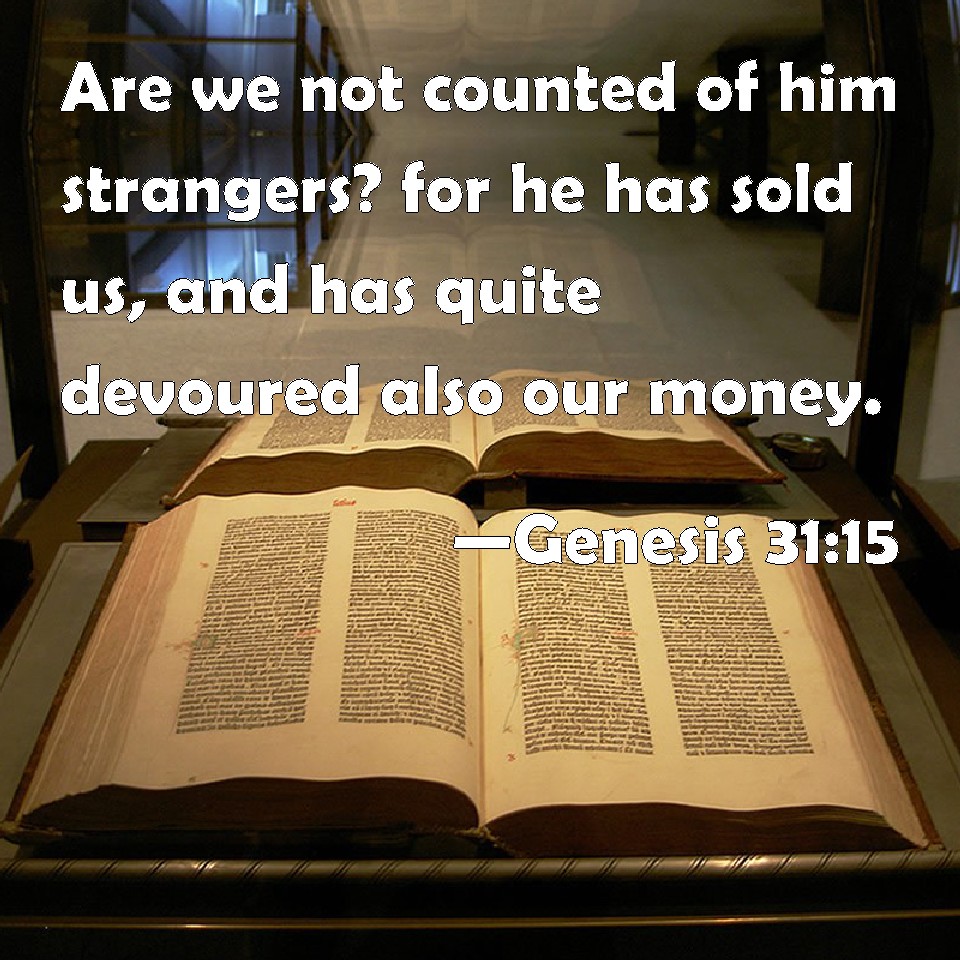 Genesis 31:15 Are we not counted of him strangers? for he has sold us, and has quite devoured also our money.