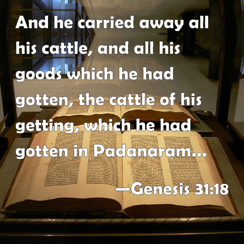 Choose a Background Genesis 31:18 And he carried away all his cattle, and all his goods which he had gotten, the cattle of his getting, which he had gotten in Padanaram, for to go to Isaac his father in the land of Canaan. KJV: And he carried away all his cattle, and all his goods which he had gotten, the cattle of his getting, which he had gotten in Padanaram, for to go to Isaac his father in the land of Canaan. DRB: And he took all his substance, and flocks, and whatsoever he had gotten in Mesopotamia, and went forward to Isaac his father to the land of Chanaan. DBT: and carried away all his cattle, and all his property that he had acquired the cattle of his possessions that he had acquired in Padan-Aram, to go to Isaac his father, into the land of Canaan. ERV: and he carried away all his cattle, and all his substance which he had gathered, the cattle of his getting, which he had gathered in Paddan-aram, for to go to Isaac his father unto the land of Canaan. WBT: And he carried away all his cattle, and all his goods which he had gained, the cattle of his getting, which he had gained in Padan-aram; to go to Isaac, his father, in the land of Canaan. WEB: and he took away all his livestock, and all his possessions which he had gathered, including the livestock which he had gained in Paddan Aram, to go to Isaac his father, to the land of Canaan. YLT: and leadeth all his cattle, and all his substance which he hath acquired, the cattle of his getting, which he hath acquired in Padan-Aram, to go unto Isaac his father, to the land of Canaan.Links Genesis 31:18 NIV • Genesis 31:18 NLT • Genesis 31:18 ESV • Genesis 31:18 NASB • Genesis 31:18 KJV • Genesis 31:18 Interlinear • Genesis 31:18 Commentaries • Genesis 31:18 Parallel Texts • Genesis 31:18 Bible Apps • Genesis 31:18 Parallel • Bible Hub |