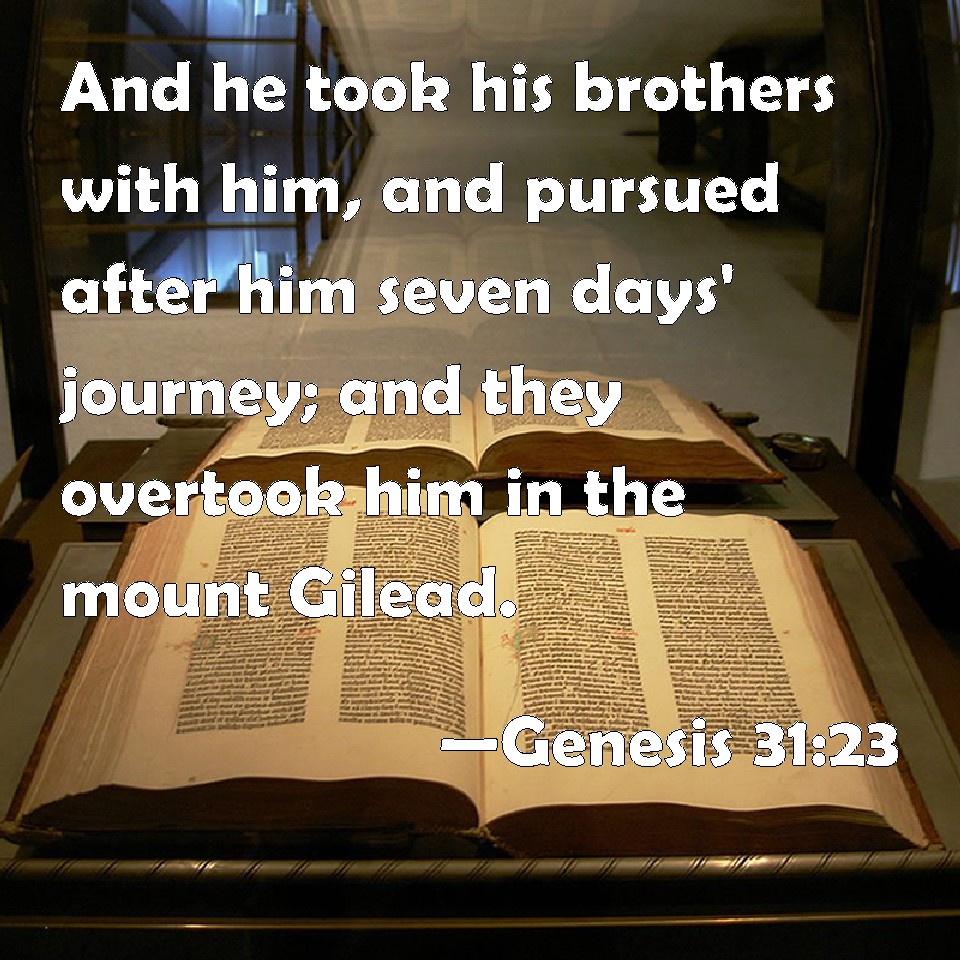 Choose a Background Genesis 31:23 And he took his brothers with him, and pursued after him seven days' journey; and they overtook him in the mount Gilead. KJV: And he took his brethren with him, and pursued after him seven days' journey; and they overtook him in the mount Gilead. DRB: And he took his brethren with him, and pursued after him seven days; and overtook him in the mount of Galaad. DBT: And he took his brethren with him, and pursued after him seven days' journey, and overtook him on mount Gilead. ERV: And he took his brethren with him, and pursued after him seven days' journey; and he overtook him in the mountain of Gilead. WBT: And he took his brethren with him, and pursued after him seven days' journey: and they overtook him in the mount Gilead. WEB: He took his relatives with him, and pursued after him seven days' journey. He overtook him in the mountain of Gilead. YLT: and he taketh his brethren with him, and pursueth after him a journey of seven days, and overtaketh him in the mount of Gilead.Links Genesis 31:23 NIV • Genesis 31:23 NLT • Genesis 31:23 ESV • Genesis 31:23 NASB • Genesis 31:23 KJV • Genesis 31:23 Interlinear • Genesis 31:23 Commentaries • Genesis 31:23 Parallel Texts • Genesis 31:23 Bible Apps • Genesis 31:23 Parallel • Bible Hub |