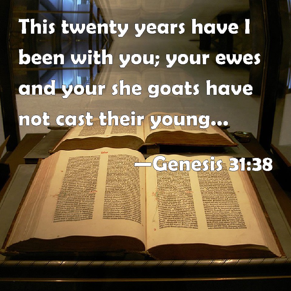 Genesis 31:38 This twenty years have I been with you; your ewes and your she goats have not cast their young, and the rams of your flock have I not eaten.