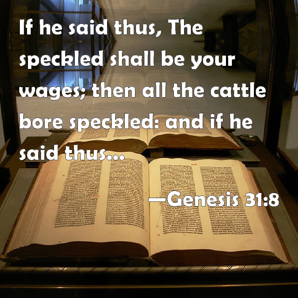 Choose a Background Genesis 31:8 If he said thus, The speckled shall be your wages; then all the cattle bore speckled: and if he said thus, The ringstraked shall be your hire; then bore all the cattle ringstraked. KJV: If he said thus, The speckled shall be thy wages; then all the cattle bare speckled: and if he said thus, The ringstraked shall be thy hire; then bare all the cattle ringstraked. DRB: If at any time he said: The speckled shall be thy wages: all the sheep brought forth speckled: but when he said on the contrary: Thou shalt take all the white ones for thy wages: all the flocks brought forth white ones. DBT: If he said thus; The speckled shall be thy hire, then all the flocks bore speckled; and if he said thus: The ringstraked shall be thy hire, then all the flocks bore ringstraked. ERV: If he said thus, The speckled shall be thy wages; then all the flock bare speckled: and if he said thus, The ringstraked shall be thy wages; then bare all the flock ringstraked. WBT: If he said thus, The speckled shall be thy wages; then all the cattle bore speckled: and if he said thus, The ring-streaked shall be thy hire; then all the cattle bore ring-streaked. WEB: If he said this, 'The speckled will be your wages,' then all the flock bore speckled. If he said this, 'The streaked will be your wages,' then all the flock bore streaked. YLT: 'If he say thus: The speckled are thy hire, then bare all the flock speckled ones; and if he say thus: The ring-streaked are thy hire, then bare all the flock ring-streaked;Links Genesis 31:8 NIV • Genesis 31:8 NLT • Genesis 31:8 ESV • Genesis 31:8 NASB • Genesis 31:8 KJV • Genesis 31:8 Interlinear • Genesis 31:8 Commentaries • Genesis 31:8 Parallel Texts • Genesis 31:8 Bible Apps • Genesis 31:8 Parallel • Bible Hub |