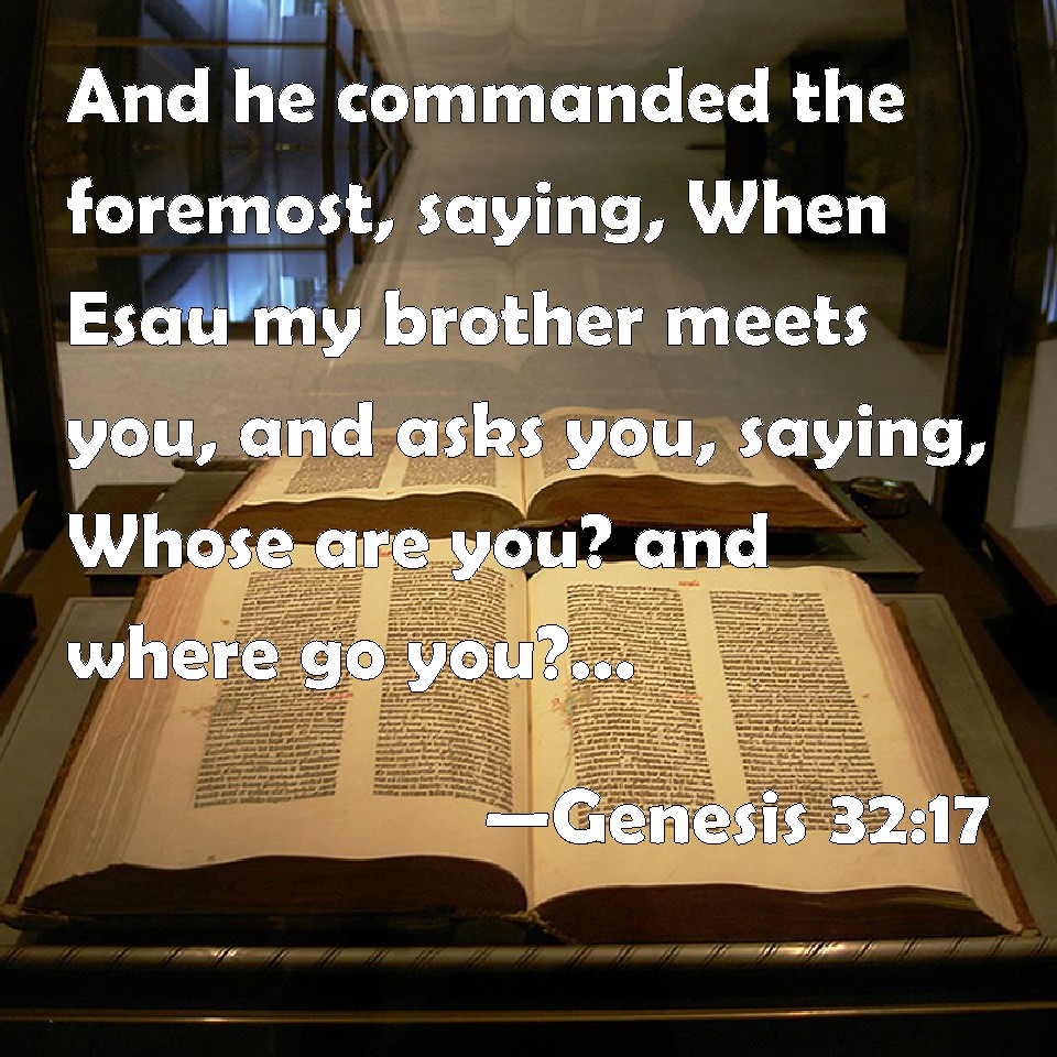 Choose a Background Genesis 32:17 And he commanded the foremost, saying, When Esau my brother meets you, and asks you, saying, Whose are you? and where go you? and whose are these before you? KJV: And he commanded the foremost, saying, When Esau my brother meeteth thee, and asketh thee, saying, Whose art thou? and whither goest thou? and whose are these before thee? DRB: And he commanded the first, saying: If thou meet my brother Esau, and he ask thee: Whose art thou? or whither goest thou? or whose are these before thee? DBT: And he commanded the foremost, saying, When Esau my brother meets thee, and asks thee, saying, Whose art thou, and where goest thou, and whose are these before thee? ERV: And he commanded the foremost, saying, When Esau my brother meeteth thee, and asketh thee, saying, Whose art thou? and whither goest thou? and whose are these before thee? WBT: And he commanded the foremost, saying, When Esau, my brother, meeteth thee, and asketh thee, saying, Whose art thou? and whither goest thou? and whose are these before thee? WEB: He commanded the foremost, saying, "When Esau, my brother, meets you, and asks you, saying, 'Whose are you? Where are you going? Whose are these before you?' YLT: And he commandeth the first, saying, 'When Esau my brother meeteth thee, and hath asked thee, saying, Whose art thou? and whither goest thou? and whose are these before thee?Links Genesis 32:17 NIV • Genesis 32:17 NLT • Genesis 32:17 ESV • Genesis 32:17 NASB • Genesis 32:17 KJV • Genesis 32:17 Interlinear • Genesis 32:17 Commentaries • Genesis 32:17 Parallel Texts • Genesis 32:17 Bible Apps • Genesis 32:17 Parallel • Bible Hub |