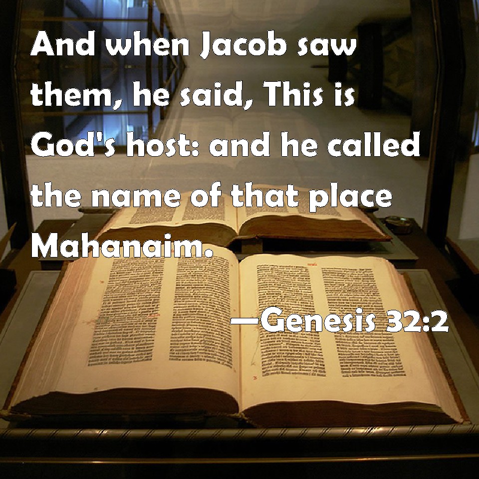 Choose a Background Genesis 32:2 And when Jacob saw them, he said, This is God's host: and he called the name of that place Mahanaim. KJV: And when Jacob saw them, he said, This is God's host: and he called the name of that place Mahanaim. DRB: And when he saw them, he said: These are the camps of God, and he called the name of that place Mahanaim, that is, Camps. DBT: And when Jacob saw them he said, This is the camp of God. And he called the name of that place Mahanaim. ERV: And Jacob said when he saw them, This is God's host: and he called the name of that place Mahanaim. WBT: And when Jacob saw them, he said, This is God's host: and he called the name of that place Mahanaim. WEB: When he saw them, Jacob said, "This is God's army." He called the name of that place Mahanaim. YLT: and Jacob saith, when he hath seen them, 'This is the camp of God;' and he calleth the name of that place 'Two Camps.'Links Genesis 32:2 NIV • Genesis 32:2 NLT • Genesis 32:2 ESV • Genesis 32:2 NASB • Genesis 32:2 KJV • Genesis 32:2 Interlinear • Genesis 32:2 Commentaries • Genesis 32:2 Parallel Texts • Genesis 32:2 Bible Apps • Genesis 32:2 Parallel • Bible Hub |