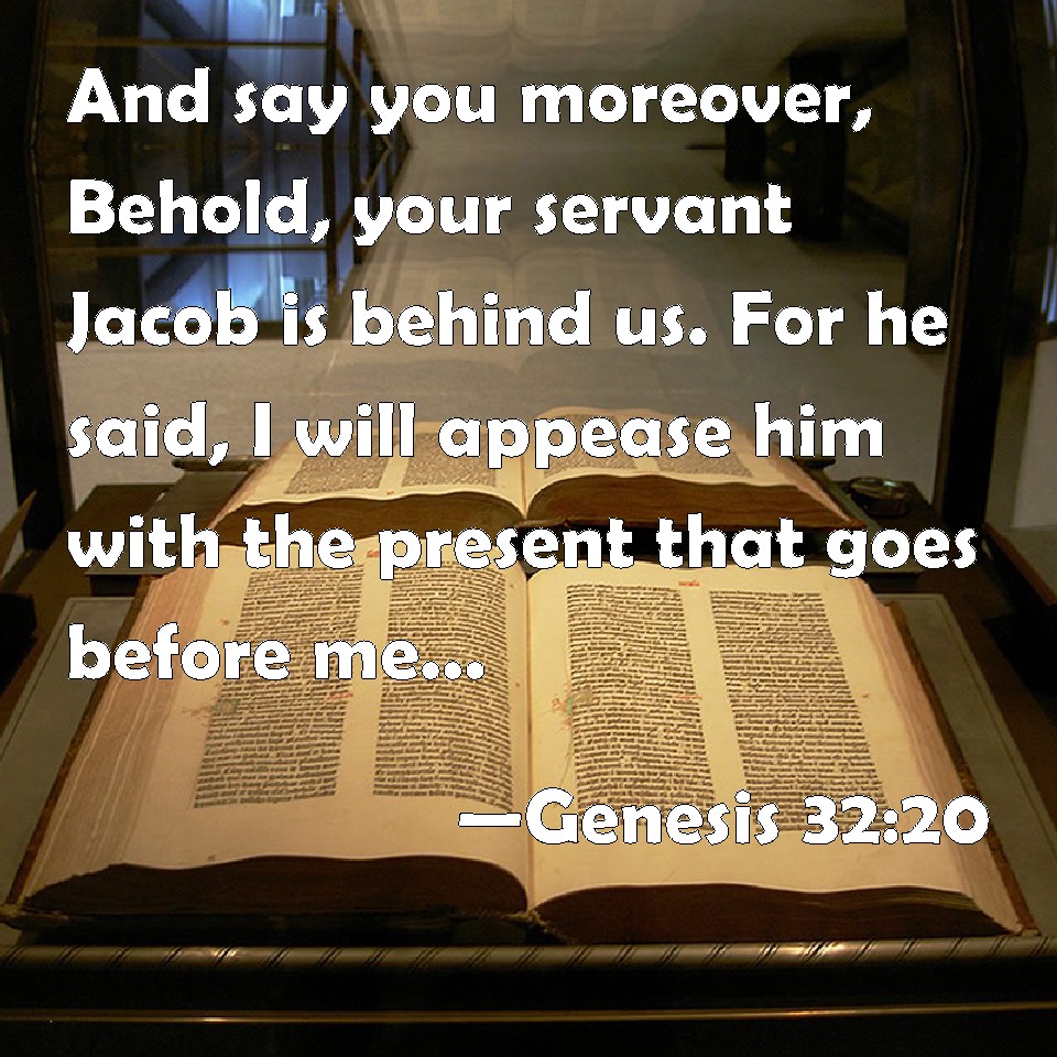 Choose a Background Genesis 32:20 And say you moreover, Behold, your servant Jacob is behind us. For he said, I will appease him with the present that goes before me, and afterward I will see his face; peradventure he will accept of me. KJV: And say ye moreover, Behold, thy servant Jacob is behind us. For he said, I will appease him with the present that goeth before me, and afterward I will see his face; peradventure he will accept of me. DRB: And ye shall add: thy servant Jacob himself also followeth after us: for he said: I will appease him with the presents that go before, and afterwards I will see him, perhaps he will be gracious to me. DBT: And, moreover, ye shall say, Behold, thy servant Jacob is behind us. For he said, I will propitiate him with the gift that goes before me, and afterwards I will see his face: perhaps he will accept me. ERV: and ye shall say, Moreover, behold, thy servant Jacob is behind us. For he said, I will appease him with the present that goeth before me, and afterward I will see his face; peradventure he will accept me. WBT: And say ye moreover, Behold, thy servant Jacob is behind us. For he said, I will appease him with the present that goeth before me, and afterward I will see his face; peradventure he will accept of me. WEB: You shall say, 'Not only that, but behold, your servant, Jacob, is behind us.'" For, he said, "I will appease him with the present that goes before me, and afterward I will see his face. Perhaps he will accept me." YLT: and ye have said also, Lo, thy servant Jacob is behind us;' for he said, 'I pacify his face with the present which is going before me, and afterwards I see his face; it may be he lifteth up my face;'Links Genesis 32:20 NIV • Genesis 32:20 NLT • Genesis 32:20 ESV • Genesis 32:20 NASB • Genesis 32:20 KJV • Genesis 32:20 Interlinear • Genesis 32:20 Commentaries • Genesis 32:20 Parallel Texts • Genesis 32:20 Bible Apps • Genesis 32:20 Parallel • Bible Hub |