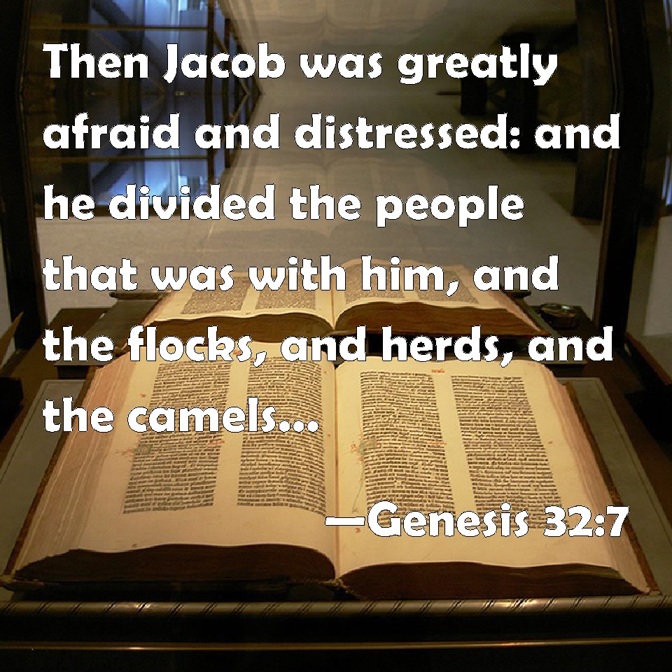 Choose a Background Genesis 32:7 Then Jacob was greatly afraid and distressed: and he divided the people that was with him, and the flocks, and herds, and the camels, into two bands; KJV: Then Jacob was greatly afraid and distressed: and he divided the people that was with him, and the flocks, and herds, and the camels, into two bands; DRB: Then Jacob was greatly afraid; and in his fear divided the people that was with him, and the flocks, and the sheep, and the oxen, and the camels, into two companies, DBT: Then Jacob was greatly afraid, and was distressed; and he divided the people that were with him, and the sheep and the cattle and the camels, into two troops. ERV: Then Jacob was greatly afraid and was distressed: and he divided the people that was with him, and the flocks, and the herds, and the camels, into two companies; WBT: Then Jacob was greatly afraid, and distressed: and he divided the people that were with him, and the flocks, and herds, and camels, into two bands; WEB: Then Jacob was greatly afraid and was distressed. He divided the people who were with him, and the flocks, and the herds, and the camels, into two companies; YLT: and Jacob feareth exceedingly, and is distressed, and he divideth the people who are with him, and the flock, and the herd, and the camels, into two camps,Links Genesis 32:7 NIV • Genesis 32:7 NLT • Genesis 32:7 ESV • Genesis 32:7 NASB • Genesis 32:7 KJV • Genesis 32:7 Interlinear • Genesis 32:7 Commentaries • Genesis 32:7 Parallel Texts • Genesis 32:7 Bible Apps • Genesis 32:7 Parallel • Bible Hub |