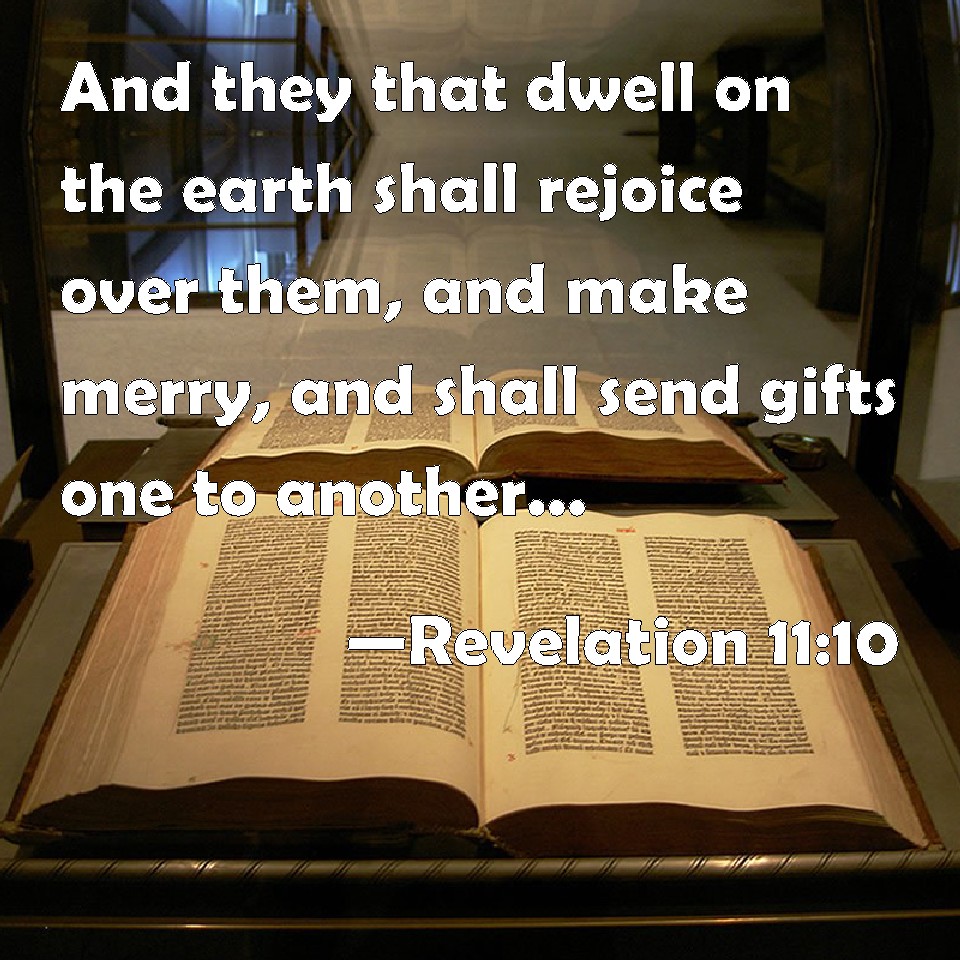 Choose a Background Revelation 11:10 And they that dwell on the earth shall rejoice over them, and make merry, and shall send gifts one to another; because these two prophets tormented them that dwelled on the earth. KJV: And they that dwell upon the earth shall rejoice over them, and make merry, and shall send gifts one to another; because these two prophets tormented them that dwelt on the earth. DRB: And they that dwell upon the earth shall rejoice over them, and make merry: and shall send gifts one to another, because these two prophets tormented them that dwelt upon the earth. DBT: And they that dwell upon the earth rejoice over them, and are full of delight, and shall send gifts one to another, because these, the two prophets, tormented them that dwell upon the earth. ERV: And they that dwell on the earth rejoice over them, and make merry; and they shall send gifts one to another; because these two prophets tormented them that dwell on the earth. WBT: And they that dwell upon the earth shall rejoice over them, and make merry, and shall send gifts one to another; because these two prophets tormented them that dwelt on the earth. WEB: Those who dwell on the earth rejoice over them, and they will be glad. They will give gifts to one another, because these two prophets tormented those who dwell on the earth. YLT: and those dwelling upon the land shall rejoice over them, and shall make merry, and gifts they shall send to one another, because these — the two prophets — did torment those dwelling upon the land.'Links Revelation 11:10 NIV • Revelation 11:10 NLT • Revelation 11:10 ESV • Revelation 11:10 NASB • Revelation 11:10 KJV • Revelation 11:10 Interlinear • Revelation 11:10 Commentaries • Revelation 11:10 Parallel Texts • Revelation 11:10 Bible Apps • Revelation 11:10 Parallel • Bible Hub |