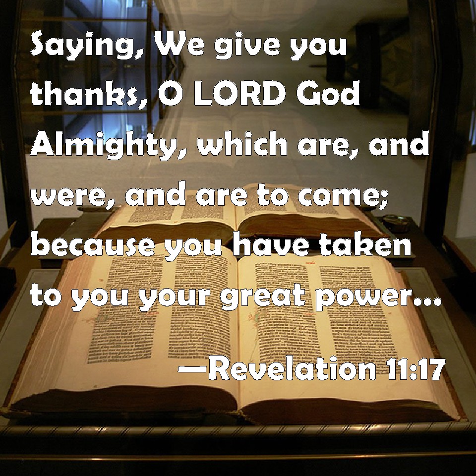 Revelation 11:17 Saying, We give you thanks, O LORD God Almighty, which are, and were, and are to come; because you have taken to you your great power, and have reigned.