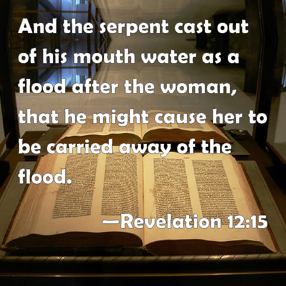 Choose a Background Revelation 12:15 And the serpent cast out of his mouth water as a flood after the woman, that he might cause her to be carried away of the flood. KJV: And the serpent cast out of his mouth water as a flood after the woman, that he might cause her to be carried away of the flood. DRB: And the serpent cast out of his mouth after the woman, water as it were a river; that he might cause her to be carried away by the river. DBT: And the serpent cast out of his mouth behind the woman water as a river, that he might make her be as one carried away by a river. ERV: And the serpent cast out of his mouth after the woman water as a river, that he might cause her to be carried away by the stream. WBT: And the serpent cast out of his mouth water as a flood after the woman, that he might cause her to be carried away by the flood. WEB: The serpent spewed water out of his mouth after the woman like a river, that he might cause her to be carried away by the stream. YLT: and the serpent did cast forth after the woman, out of his mouth, water as a river, that he may cause her to be carried away by the river,Links Revelation 12:15 NIV • Revelation 12:15 NLT • Revelation 12:15 ESV • Revelation 12:15 NASB • Revelation 12:15 KJV • Revelation 12:15 Interlinear • Revelation 12:15 Commentaries • Revelation 12:15 Parallel Texts • Revelation 12:15 Bible Apps • Revelation 12:15 Parallel • Bible Hub |