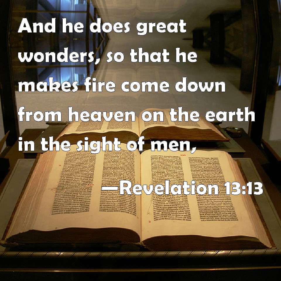 Choose a Background Revelation 13:13 And he does great wonders, so that he makes fire come down from heaven on the earth in the sight of men, KJV: And he doeth great wonders, so that he maketh fire come down from heaven on the earth in the sight of men, DRB: And he did great signs, so that he made also fire to come down from heaven unto the earth in the sight of men. DBT: And it works great signs, that it should cause even fire to come down from heaven to the earth before men. ERV: And he doeth great signs, that he should even make fire to come down out of heaven upon the earth in the sight of men. WBT: And he doeth great wonders, so that he maketh fire come down from heaven on the earth in the sight of men, WEB: He performs great signs, even making fire come down out of the sky to the earth in the sight of people. YLT: and it doth great signs, that fire also it may make to come down from the heaven to the earth before men,Links Revelation 13:13 NIV • Revelation 13:13 NLT • Revelation 13:13 ESV • Revelation 13:13 NASB • Revelation 13:13 KJV • Revelation 13:13 Interlinear • Revelation 13:13 Commentaries • Revelation 13:13 Parallel Texts • Revelation 13:13 Bible Apps • Revelation 13:13 Parallel • Bible Hub |