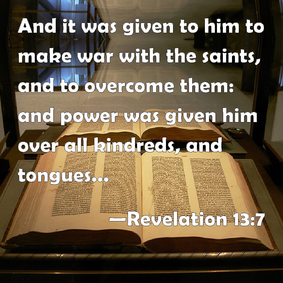 Choose a Background Revelation 13:7 And it was given to him to make war with the saints, and to overcome them: and power was given him over all kindreds, and tongues, and nations. KJV: And it was given unto him to make war with the saints, and to overcome them: and power was given him over all kindreds, and tongues, and nations. DRB: And it was given unto him to make war with the saints, and to overcome them. And power was given him over every tribe, and people, and tongue, and nation. DBT: And there was given to it to make war with the saints, and to overcome them; and there was given to it authority over every tribe, and people, and tongue, and nation; ERV: And it was given unto him to make war with the saints, and to overcome them: and there was given to him authority over every tribe and people and tongue and nation. WBT: And it was given to him to make war with the saints, and to overcome them: and power was given him over all kindreds, and languages, and nations. WEB: It was given to him to make war with the saints, and to overcome them. Authority over every tribe, people, language, and nation was given to him. YLT: and there was given to it to make war with the saints, and to overcome them, and there was given to it authority over every tribe, and tongue, and nation.Links Revelation 13:7 NIV • Revelation 13:7 NLT • Revelation 13:7 ESV • Revelation 13:7 NASB • Revelation 13:7 KJV • Revelation 13:7 Interlinear • Revelation 13:7 Commentaries • Revelation 13:7 Parallel Texts • Revelation 13:7 Bible Apps • Revelation 13:7 Parallel • Bible Hub |