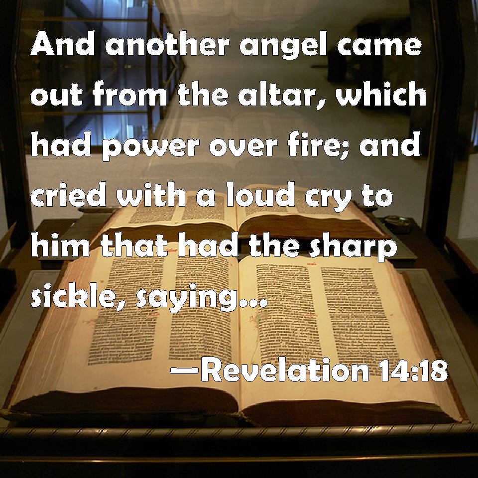 Choose a Background Revelation 14:18 And another angel came out from the altar, which had power over fire; and cried with a loud cry to him that had the sharp sickle, saying, Thrust in your sharp sickle, and gather the clusters of the vine of the earth; for her grapes are fully ripe. KJV: And another angel came out from the altar, which had power over fire; and cried with a loud cry to him that had the sharp sickle, saying, Thrust in thy sharp sickle, and gather the clusters of the vine of the earth; for her grapes are fully ripe. DRB: And another angel came out from the altar, who had power over fire; and he cried with a loud voice to him that had the sharp sickle, saying: Thrust in thy sharp sickle, and gather the clusters of the vineyard of the earth; because the grapes thereof are ripe. DBT: And another angel came out of the altar, having power over fire, and called with a loud cry to him that had the sharp sickle, saying, Send thy sharp sickle, and gather the bunches of the vine of the earth; for her grapes are fully ripened. ERV: And another angel came out from the altar, he that hath power over fire; and he called with a great voice to him that had the sharp sickle, saying, Send forth thy sharp sickle, and gather the clusters of the vine of the earth; for her grapes are fully ripe. WBT: And another angel came out from the altar, who had power over fire; and cried with a loud cry to him that had the sharp sickle, saying, Thrust in thy sharp sickle, and gather the clusters of the vine of the earth; for her grapes are fully ripe. WEB: Another angel came out from the altar, he who has power over fire, and he called with a great voice to him who had the sharp sickle, saying, "Send forth your sharp sickle, and gather the clusters of the vine of the earth, for the earth's grapes are fully ripe!" YLT: and another messenger did come forth out from the altar, having authority over the fire, and he called with a great cry to him having the sharp sickle, saying, 'Send forth thy sharp sickle, and gather the clusters of the vine of the earth, because come to perfection have her grapes;'Links Revelation 14:18 NIV • Revelation 14:18 NLT • Revelation 14:18 ESV • Revelation 14:18 NASB • Revelation 14:18 KJV • Revelation 14:18 Interlinear • Revelation 14:18 Commentaries • Revelation 14:18 Parallel Texts • Revelation 14:18 Bible Apps • Revelation 14:18 Parallel • Bible Hub |