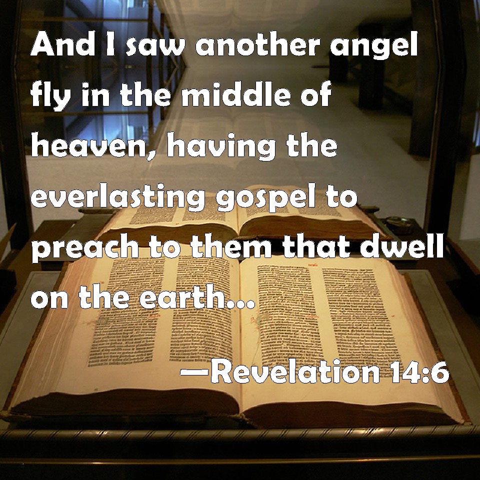 Choose a Background Revelation 14:6 And I saw another angel fly in the middle of heaven, having the everlasting gospel to preach to them that dwell on the earth, and to every nation, and kindred, and tongue, and people, KJV: And I saw another angel fly in the midst of heaven, having the everlasting gospel to preach unto them that dwell on the earth, and to every nation, and kindred, and tongue, and people, DRB: And I saw another angel flying through the midst of heaven, having the eternal gospel, to preach unto them that sit upon the earth, and over every nation, and tribe, and tongue, and people: DBT: And I saw another angel flying in mid-heaven, having the everlasting glad tidings to announce to those settled on the earth, and to every nation and tribe and tongue and people, ERV: And I saw another angel flying in mid heaven, having an eternal gospel to proclaim unto them that dwell on the earth, and unto every nation and tribe and tongue and people; WBT: And I saw another angel fly in the midst of heaven, having the everlasting gospel to preach to them that dwell on the earth, and to every nation, and kindred, and language, and people, WEB: I saw an angel flying in mid heaven, having an eternal Good News to proclaim to those who dwell on the earth, and to every nation, tribe, language, and people. YLT: And I saw another messenger flying in mid-heaven, having good news age-during to proclaim to those dwelling upon the earth, and to every nation, and tribe, and tongue, and people,Links Revelation 14:6 NIV • Revelation 14:6 NLT • Revelation 14:6 ESV • Revelation 14:6 NASB • Revelation 14:6 KJV • Revelation 14:6 Interlinear • Revelation 14:6 Commentaries • Revelation 14:6 Parallel Texts • Revelation 14:6 Bible Apps • Revelation 14:6 Parallel • Bible Hub |