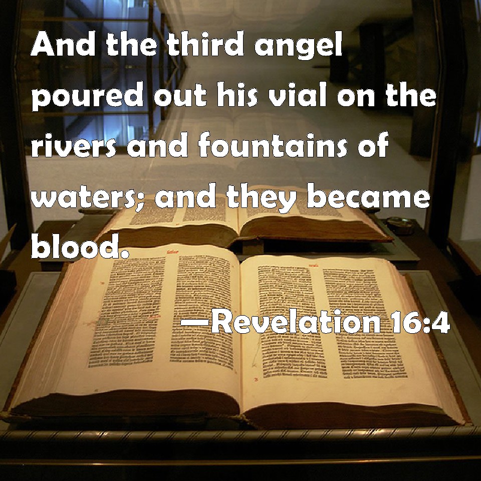 Revelation 16:4 And the third angel poured out his vial on the rivers and fountains of waters; and they became blood.