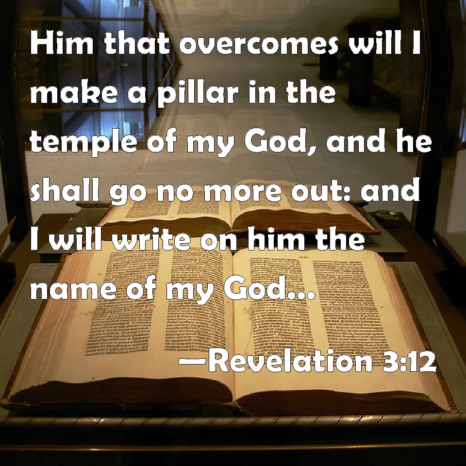 Choose a Background Revelation 3:12 Him that overcomes will I make a pillar in the temple of my God, and he shall go no more out: and I will write on him the name of my God, and the name of the city of my God, which is new Jerusalem, which comes down out of heaven from my God: and I will write on him my new name. KJV: Him that overcometh will I make a pillar in the temple of my God, and he shall go no more out: and I will write upon him the name of my God, and the name of the city of my God, which is new Jerusalem, which cometh down out of heaven from my God: and I will write upon him my new name. DRB: He that shall overcome, I will make him a pillar in the temple of my God; and he shall go out no more; and I will write upon him the name of my God, and the name of the city of my God, the new Jerusalem, which cometh down out of heaven from my God, and my new name. DBT: He that overcomes, him will I make a pillar in the temple of my God, and he shall go no more at all out; and I will write upon him the name of my God, and the name of the city of my God, the new Jerusalem, which comes down out of heaven, from my God, and my new name. ERV: He that overcometh, I will make him a pillar in the temple of my God, and he shall go out thence no more: and I will write upon him the name of my God, and the name of the city of my God, the new Jerusalem, which cometh down out of heaven from my God, and mine own new name. WBT: Him that overcometh, will I make a pillar in the temple of my God, and he shall go out no more: and I will write upon him the name of my God, and the name of the city of my God, which is new Jerusalem, which cometh down out of heaven from my God: and I will write upon him my new name. WEB: He who overcomes, I will make him a pillar in the temple of my God, and he will go out from there no more. I will write on him the name of my God, and the name of the city of my God, the new Jerusalem, which comes down out of heaven from my God, and my own new name. YLT: He who is overcoming — I will make him a pillar in the sanctuary of my God, and without he may not go any more, and I will write upon him the name of my God, and the name of the city of my God, the new Jerusalem, that doth come down out of the heaven from my God — also my new name.Links Revelation 3:12 NIV • Revelation 3:12 NLT • Revelation 3:12 ESV • Revelation 3:12 NASB • Revelation 3:12 KJV • Revelation 3:12 Interlinear • Revelation 3:12 Commentaries • Revelation 3:12 Parallel Texts • Revelation 3:12 Bible Apps • Revelation 3:12 Parallel • Bible Hub |