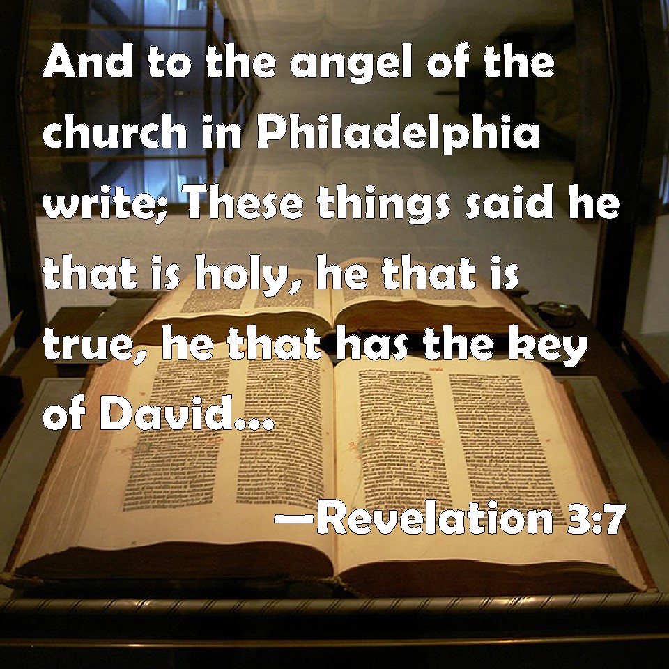 Choose a Background Revelation 3:7 And to the angel of the church in Philadelphia write; These things said he that is holy, he that is true, he that has the key of David, he that opens, and no man shuts; and shuts, and no man opens; KJV: And to the angel of the church in Philadelphia write; These things saith he that is holy, he that is true, he that hath the key of David, he that openeth, and no man shutteth; and shutteth, and no man openeth; DRB: And to the angel of the church of Philadelphia, write: These things saith the Holy One and the true one, he that hath the key of David; he that openeth, and no man shutteth; shutteth, and no man openeth: DBT: And to the angel of the assembly in Philadelphia write: These things saith the holy, the true; he that has the key of David, he who opens and no one shall shut, and shuts and no one shall open: ERV: And to the angel of the church in Philadelphia write; These things saith he that is holy, he that is true, he that hath the key of David, he that openeth, and none shall shut, and that shutteth, and none openeth: WBT: And to the angel of the church in Philadelphia write; These things saith he that is holy, he that is true, he that hath the key of David, he that openeth, and no man shutteth; and shutteth, and no man openeth: WEB: "To the angel of the assembly in Philadelphia write: "He who is holy, he who is true, he who has the key of David, he who opens and no one can shut, and who shuts and no one opens, says these things: YLT: 'And to the messenger of the assembly in Philadelphia write: These things saith he who is holy, he who is true, he who is having the key of David, he who is opening and no one doth shut, and he shutteth and no one doth open!Links Revelation 3:7 NIV • Revelation 3:7 NLT • Revelation 3:7 ESV • Revelation 3:7 NASB • Revelation 3:7 KJV • Revelation 3:7 Interlinear • Revelation 3:7 Commentaries • Revelation 3:7 Parallel Texts • Revelation 3:7 Bible Apps • Revelation 3:7 Parallel • Bible Hub |