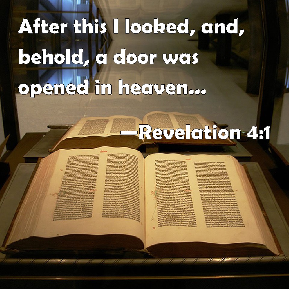 Choose a Background Revelation 4:1 After this I looked, and, behold, a door was opened in heaven: and the first voice which I heard was as it were of a trumpet talking with me; which said, Come up here, and I will show you things which must be hereafter. KJV: After this I looked, and, behold, a door was opened in heaven: and the first voice which I heard was as it were of a trumpet talking with me; which said, Come up hither, and I will shew thee things which must be hereafter. DRB: After these things I looked, and behold a door was opened in heaven, and the first voice which I heard, as it were, of a trumpet speaking with me, said: Come up hither, and I will shew thee the things which must be done hereafter. DBT: After these things I saw, and behold, a door opened in heaven, and the first voice which I heard as of a trumpet speaking with me, saying, Come up here, and I will shew thee the things which must take place after these things. ERV: After these things I saw, and behold, a door opened in heaven, and the first voice which I heard, a voice as of a trumpet speaking with me, one saying, Come up hither, and I will shew thee the things which must come to pass hereafter. WBT: After this I looked, and behold, a door was opened in heaven: and the first voice which I heard, was as it were of a trumpet talking with me; which said, Come up hither, and I will show thee things which must be hereafter. WEB: After these things I looked and saw a door opened in heaven, and the first voice that I heard, like a trumpet speaking with me, was one saying, "Come up here, and I will show you the things which must happen after this." YLT: After these things I saw, and lo, a door opened in the heaven, and the first voice that I heard is as of a trumpet speaking with me, saying, 'Come up hither, and I will shew thee what it behoveth to come to pass after these things;'Links Revelation 4:1 NIV • Revelation 4:1 NLT • Revelation 4:1 ESV • Revelation 4:1 NASB • Revelation 4:1 KJV • Revelation 4:1 Interlinear • Revelation 4:1 Commentaries • Revelation 4:1 Parallel Texts • Revelation 4:1 Bible Apps • Revelation 4:1 Parallel • Bible Hub |