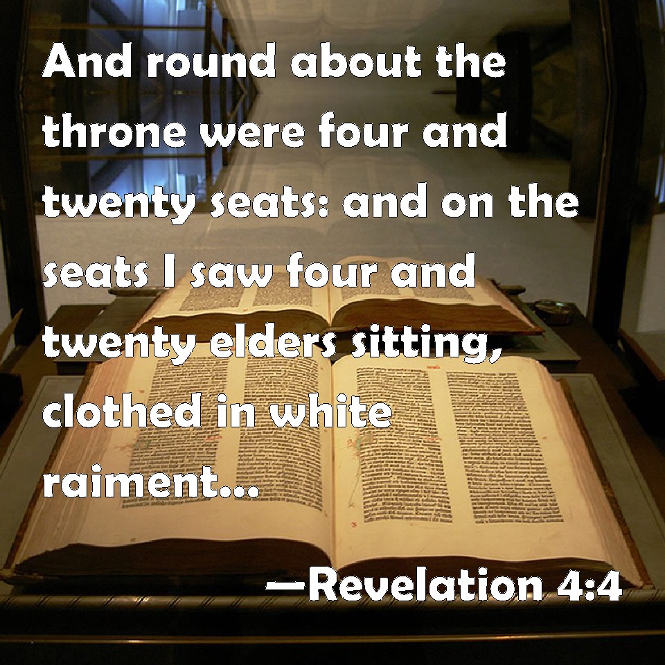 Choose a Background Revelation 4:4 And round about the throne were four and twenty seats: and on the seats I saw four and twenty elders sitting, clothed in white raiment; and they had on their heads crowns of gold. KJV: And round about the throne were four and twenty seats: and upon the seats I saw four and twenty elders sitting, clothed in white raiment; and they had on their heads crowns of gold. DRB: And round about the throne were four and twenty seats; and upon the seats, four and twenty ancients sitting, clothed in white garments, and on their heads were crowns of gold. DBT: And round the throne twenty-four thrones, and on the thrones twenty-four elders sitting, clothed with white garments; and on their heads golden crowns. ERV: And round about the throne were four and twenty thrones: and upon the thrones I saw four and twenty elders sitting, arrayed in white garments; and on their heads crowns of gold. WBT: And around the throne were four and twenty seats; and upon the seats I saw four and twenty elders sitting, clothed in white raiment; and they had on their heads crowns of gold. WEB: Around the throne were twenty-four thrones. On the thrones were twenty-four elders sitting, dressed in white garments, with crowns of gold on their heads. YLT: And around the throne are thrones twenty and four, and upon the thrones I saw the twenty and four elders sitting, clothed in white garments, and they had upon their heads crowns of gold;Links Revelation 4:4 NIV • Revelation 4:4 NLT • Revelation 4:4 ESV • Revelation 4:4 NASB • Revelation 4:4 KJV • Revelation 4:4 Interlinear • Revelation 4:4 Commentaries • Revelation 4:4 Parallel Texts • Revelation 4:4 Bible Apps • Revelation 4:4 Parallel • Bible Hub |