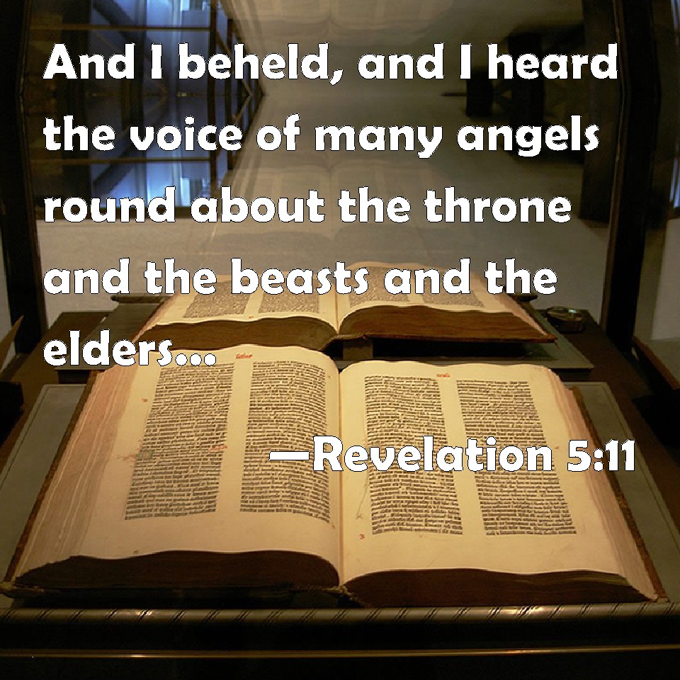 Choose a Background Revelation 5:11 And I beheld, and I heard the voice of many angels round about the throne and the beasts and the elders: and the number of them was ten thousand times ten thousand, and thousands of thousands; KJV: And I beheld, and I heard the voice of many angels round about the throne and the beasts and the elders: and the number of them was ten thousand times ten thousand, and thousands of thousands; DRB: And I beheld, and I heard the voice of many angels round about the throne, and the living creatures, and the ancients; and the number of them was thousands of thousands, DBT: And I saw, and I heard the voice of many angels around the throne and the living creatures and the elders; and their number was ten thousands of ten thousands and thousands of thousands; ERV: And I saw, and I heard a voice of many angels round about the throne and the living creatures and the elders; and the number of them was ten thousand times ten thousand, and thousands of thousands; WBT: And I beheld, and I heard the voice of many angels around the throne, and the living beings, and the elders: and the number of them was ten thousand times ten thousand, and thousands of thousands; WEB: I saw, and I heard something like a voice of many angels around the throne, the living creatures, and the elders; and the number of them was ten thousands of ten thousands, and thousands of thousands; YLT: And I saw, and I heard the voice of many messengers round the throne, and the living creatures, and the elders — and the number of them was myriads of myriads, and thousands of thousands — Links Revelation 5:11 NIV • Revelation 5:11 NLT • Revelation 5:11 ESV • Revelation 5:11 NASB • Revelation 5:11 KJV • Revelation 5:11 Interlinear • Revelation 5:11 Commentaries • Revelation 5:11 Parallel Texts • Revelation 5:11 Bible Apps • Revelation 5:11 Parallel • Bible Hub |