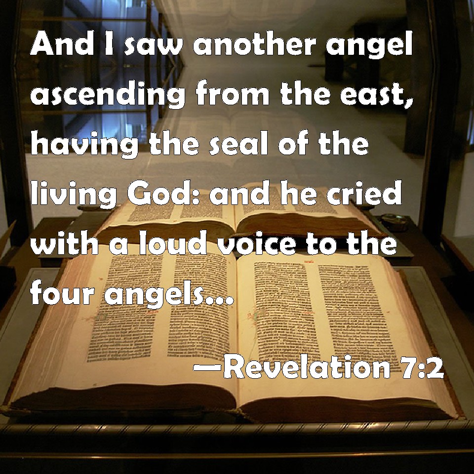 Choose a Background Revelation 7:2 And I saw another angel ascending from the east, having the seal of the living God: and he cried with a loud voice to the four angels, to whom it was given to hurt the earth and the sea, KJV: And I saw another angel ascending from the east, having the seal of the living God: and he cried with a loud voice to the four angels, to whom it was given to hurt the earth and the sea, DRB: And I saw another angel ascending from the rising of the sun, having the sign of the living God; and he cried with a loud voice to the four angels, to whom it was given to hurt the earth and the sea, DBT: And I saw another angel ascending from the sunrising, having the seal of the living God; and he cried with a loud voice to the four angels to whom it had been given to hurt the earth and the sea, ERV: And I saw another angel ascend from the sunrising, having the seal of the living God: and he cried with a great voice to the four angels, to whom it was given to hurt the earth and the sea, WBT: And I saw another angel ascending from the east, having the seal of the living God: and he cried with a loud voice to the four angels, to whom it was given to hurt the earth and the sea, WEB: I saw another angel ascend from the sunrise, having the seal of the living God. He cried with a loud voice to the four angels to whom it was given to harm the earth and the sea, YLT: and I saw another messenger going up from the rising of the sun, having a seal of the living God, and he did cry with a great voice to the four messengers, to whom it was given to injure the land and the sea, saying,Links Revelation 7:2 NIV • Revelation 7:2 NLT • Revelation 7:2 ESV • Revelation 7:2 NASB • Revelation 7:2 KJV • Revelation 7:2 Interlinear • Revelation 7:2 Commentaries • Revelation 7:2 Parallel Texts • Revelation 7:2 Bible Apps • Revelation 7:2 Parallel • Bible Hub |