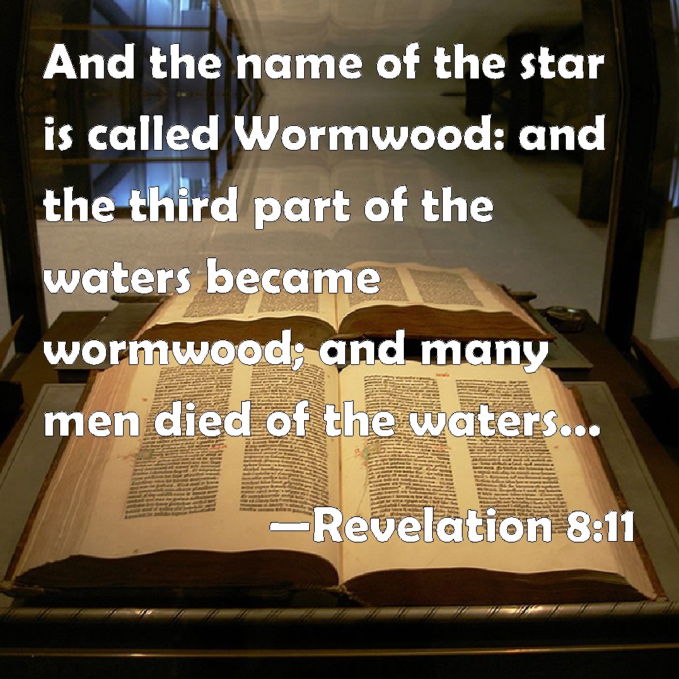 Choose a Background Revelation 8:11 And the name of the star is called Wormwood: and the third part of the waters became wormwood; and many men died of the waters, because they were made bitter. KJV: And the name of the star is called Wormwood: and the third part of the waters became wormwood; and many men died of the waters, because they were made bitter. DRB: And the name of the star is called Wormwood. And the third part of the waters became wormwood; and many men died of the waters, because they were made bitter. DBT: And the name of the star is called Wormwood; and the third part of the waters became wormwood, and many of the men died of the waters because they were made bitter. ERV: and the name of the star is called Wormwood: and the third part of the waters became wormwood; and many men died of the waters, because they were made bitter. WBT: And the name of the star is called Wormwood: and the third part of the waters became wormwood; and many men died by the waters, because they were made bitter. WEB: The name of the star is called "Wormwood." One third of the waters became wormwood. Many people died from the waters, because they were made bitter. YLT: and the name of the star is called Wormwood, and the third of the waters doth become wormwood, and many of the men did die of the waters, because they were made bitter.Links Revelation 8:11 NIV • Revelation 8:11 NLT • Revelation 8:11 ESV • Revelation 8:11 NASB • Revelation 8:11 KJV • Revelation 8:11 Interlinear • Revelation 8:11 Commentaries • Revelation 8:11 Parallel Texts • Revelation 8:11 Bible Apps • Revelation 8:11 Parallel • Bible Hub |