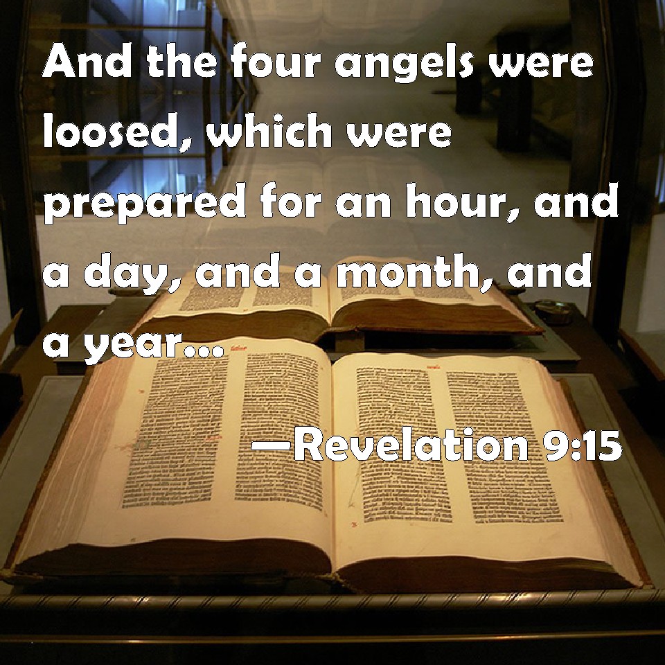 Choose a Background Revelation 9:15 And the four angels were loosed, which were prepared for an hour, and a day, and a month, and a year, for to slay the third part of men. KJV: And the four angels were loosed, which were prepared for an hour, and a day, and a month, and a year, for to slay the third part of men. DRB: And the four angels were loosed, who were prepared for an hour, and a day, and a month, and a year: for to kill the third part of men. DBT: And the four angels were loosed, who are prepared for the hour and day and month and year, that they might slay the third part of men; ERV: And the four angels were loosed, which had been prepared for the hour and day and month and year, that they should kill the third part of men. WBT: And the four angels were loosed, who were prepared for an hour, and a day, and a month, and a year, to slay the third part of men. WEB: The four angels were freed who had been prepared for that hour and day and month and year, so that they might kill one third of mankind. YLT: and loosed were the four messengers, who have been made ready for the hour, and day, and month, and year, that they may kill the third of men;Links Revelation 9:15 NIV • Revelation 9:15 NLT • Revelation 9:15 ESV • Revelation 9:15 NASB • Revelation 9:15 KJV • Revelation 9:15 Interlinear • Revelation 9:15 Commentaries • Revelation 9:15 Parallel Texts • Revelation 9:15 Bible Apps • Revelation 9:15 Parallel • Bible Hub |
